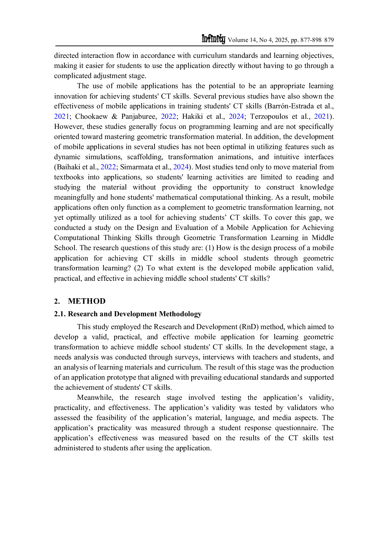 Berdasarkan hasil dan pembahasan penelitian ini, dapat disimpulkan bahwa proses merancang aplikasi mobile untuk mencapai kemampuan berpikir komputasi siswa sekolah menengah melalui pembelajaran transformasi geometris melibatkan analisis kebutuhan, analisis materi dan kurikulum, serta desain aplikasi yang mengintegrasikan simulasi interaktif dan fitur yang mendukung konstruksi pengetahuan aktif.Aplikasi mobile yang dikembangkan terbukti valid berdasarkan aspek materi, bahasa, dan media, praktis berdasarkan hasil kuesioner respons siswa, dan efektif dalam mencapai kemampuan berpikir komputasi siswa sekolah menengah, dengan skor rata-rata post-test siswa melebihi nilai minimum kelulusan.