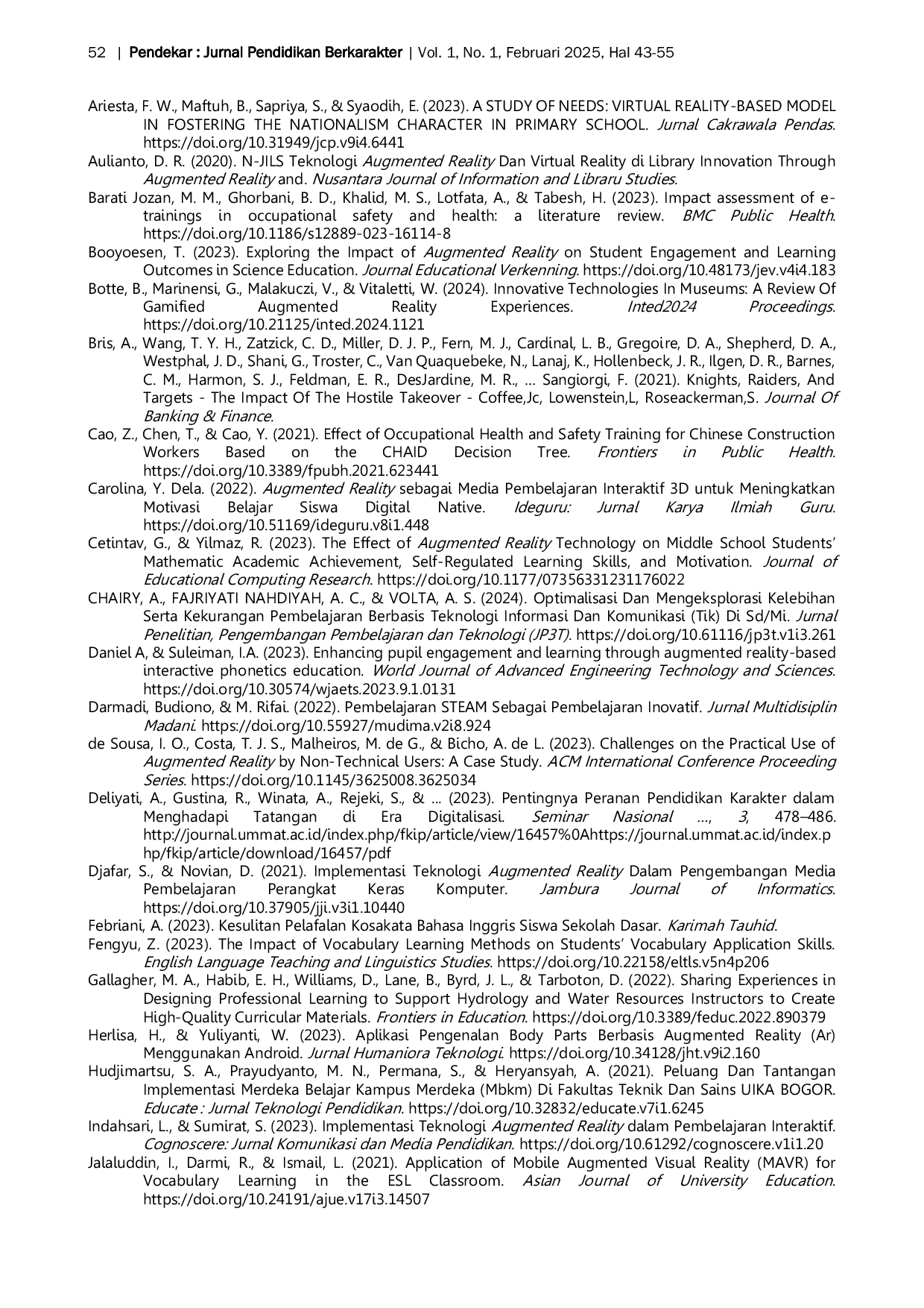 - STUDI LITERATUR: PEMBELAJARAN MENGGUNAKAN MEDIA AUGMENTED REALITY DI SEKOLAH MENENGAH KEJURUAN | Jurnal... ejournal.unesa.ac.id/index.php/jurnal-pendidikan-teknik-elektro/article/view/47891STUDI LITERATUR PEMBELAJARAN MENGGUNAKAN MEDIA AUGMENTED REALITY DI SEKOLAH MENENGAH KEJURUAN Jurnal ejournal unesa ac index php jurnal pendidikan teknik elektro article view 47891