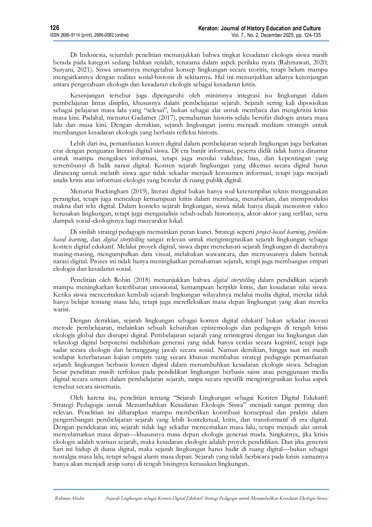 Keraton: Journal of History Education and CultureKeraton: Journal of History Education and CulturePenelitian ini bertujuan untuk menganalisis efektivitas sejarah lingkungan sebagai konten digital edukatif dalam menumbuhkan kesadaran ekologis siswa melalui strategi pedagogis berbasis project-based storytelling di Kota Surabaya. Hasil penelitian menunjukkan adanya peningkatan signifikan kesadaran ekologis siswa setelah implementasi pembelajaran, terutama pada dimensi sikap ekologis, diikuti oleh pengetahuan dan perilaku. Pemanfaatan konten digital berupa video dokumenter, arsip visual, dan peta interaktif sejarah lingkungan Surabaya terbukti meningkatkan keterlibatan belajar, kemampuan berpikir kritis, serta empati ekologis siswa. Strategi project-based learning berbasis digital storytelling mendorong siswa menjadi subjek aktif dalam merekonstruksi sejarah lingkungan wilayahnya. Penelitian ini menyimpulkan bahwa integrasi sejarah lingkungan dan teknologi digital merupakan pendekatan strategis untuk membangun kesadaran ekologis siswa secara reflektif, kritis, dan berkelanjutan.