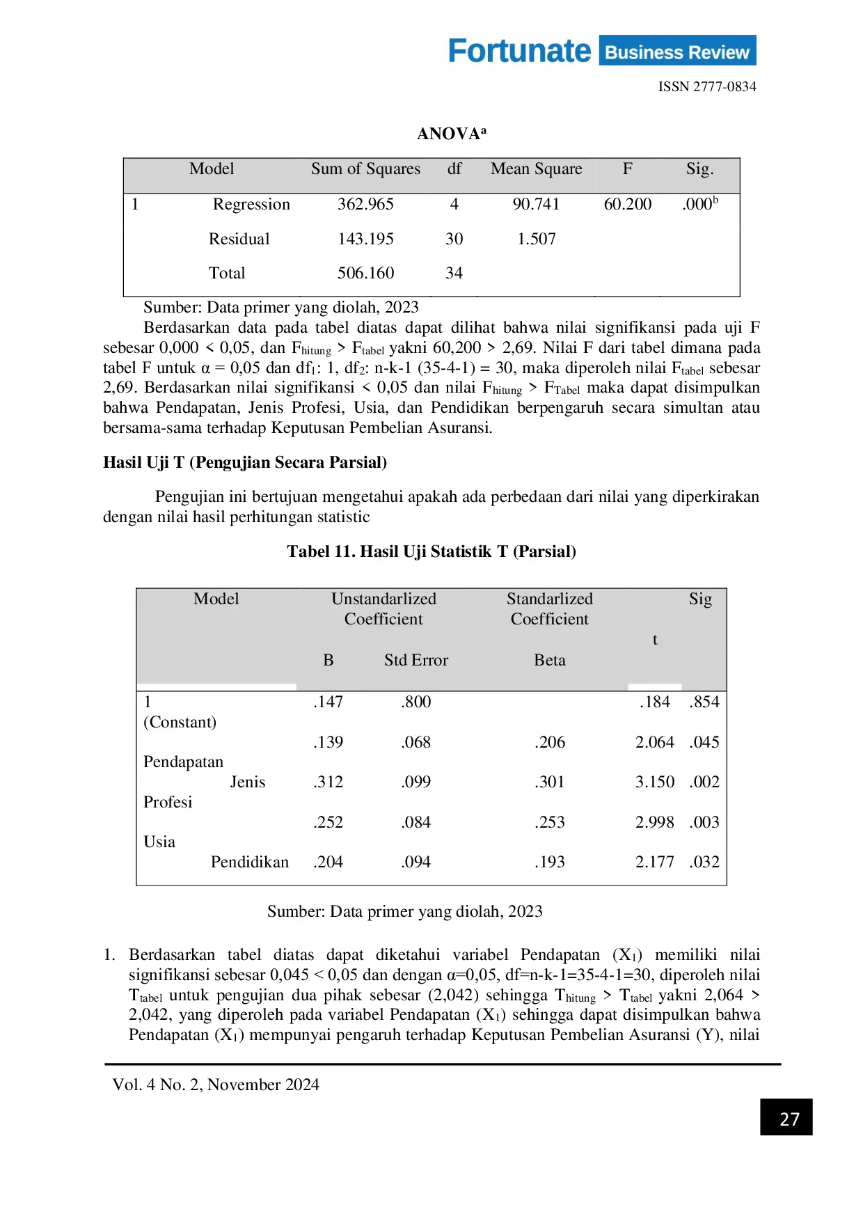 Fortunate Business ReviewFortunate Business ReviewSetiap orang tidak pernah lepas dari masalah dan resiko, yang pada akhirnya dapat merugikan diri sendiri dan orang lain. Sehingga tindakan pencegahan akan resiko menjadi penting, salah satunya adalah dengan keikutsertaan dalam asuransi. Namun masyarakat di Indonesia masih banyak yang tidak memiliki asuransi sehingga, penelitian dilakukan dengan menyebarkan kuesioner melalui google form kepada 35 nasabah asuransi perusahaan swasta dengan teknik random sampling dengan metode kuantitatif dan penelitian kepustakaan (library research) berfokus pada faktor penghasilan, profesi, usia, dan pendidikan yang mempengaruhi keputusan masyarakat dalam berpartisipasi dalam asuransi. Pengolahan data penelitian menggunakan SPSS versi 21. Metode analisis penelitiannya menggunakan Analisis Regresi Linear Berganda, hasil uji f penelitian ini menunjukan bahwa variabel independen secara simultan mempunyai pengaruh terhadap variabel dependen. Selanjutnya, hasil uji T menunjukan bahwa Pendapatan, Jenis Profesi, Usia dan pendidikan berpengaruh signifikan terhadap Keputusan Pembelian Asuransi Kesehatan. Dalam penelitian ini, jenis profesi merupakan variabel yang paling berpengaruh signifikan.
