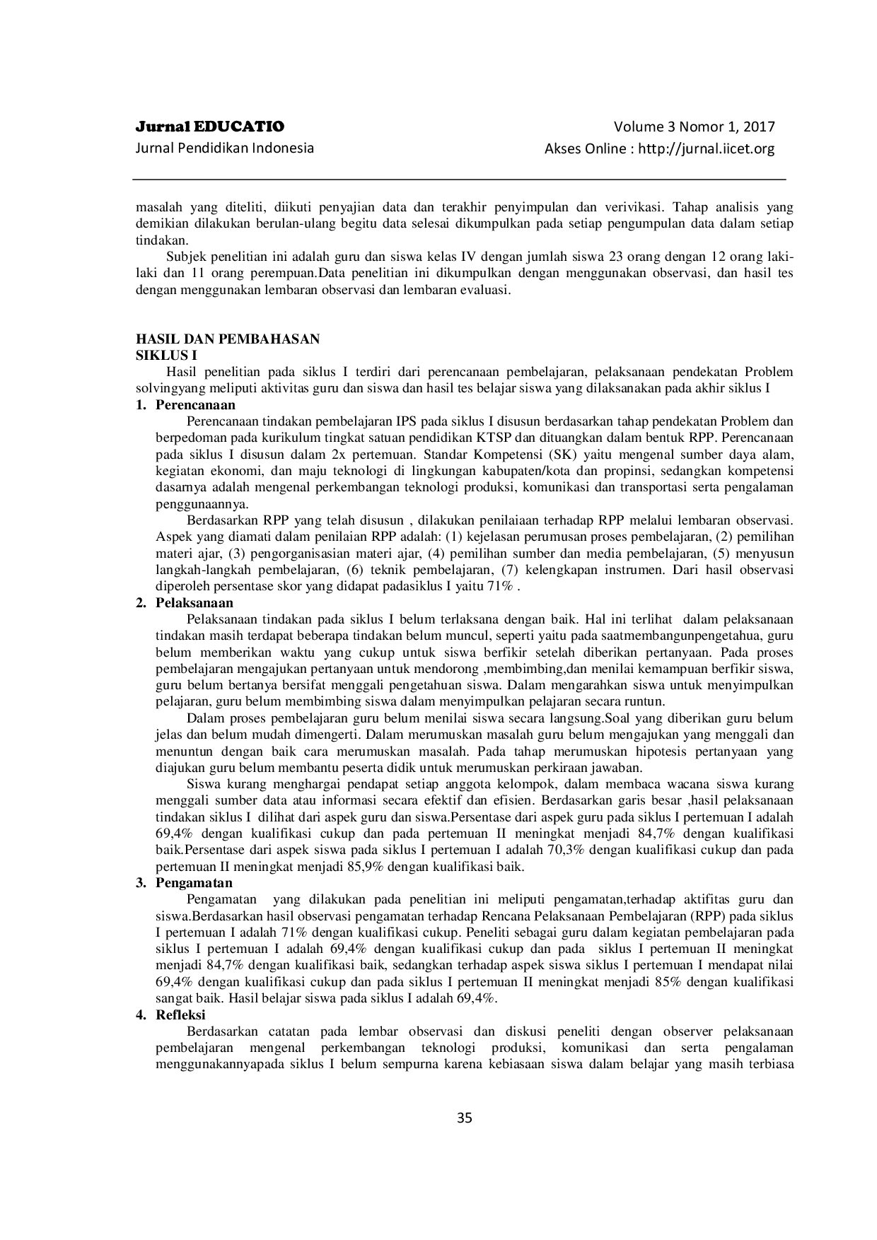Jurnal EDUCATIO: Jurnal Pendidikan IndonesiaJurnal EDUCATIO: Jurnal Pendidikan IndonesiaPenelitian ini bertujuan untuk meningkatkan hasil belajar peserta didik pada pembelajaran IPS menggunakan pendekatan problem solving di kelas IV SDN 21 Batang Anai. Penelitian ini menggunakan pendekatan kualitatif dan kuantitatif. Subjek penelitian adalah guru dan siswa kelas IV SDN 21 Batang Anai dengan jumlah 23 siswa. Hasil penelitian menunjukkan peningkatan hasil belajar siswa dari siklus I (66,95%) menjadi siklus II (81,30%). Dengan demikian, pendekatan problem solving dapat meningkatkan hasil belajar IPS di kelas IV SDN 21 Batang Anai Kabupaten Padang Pariaman.