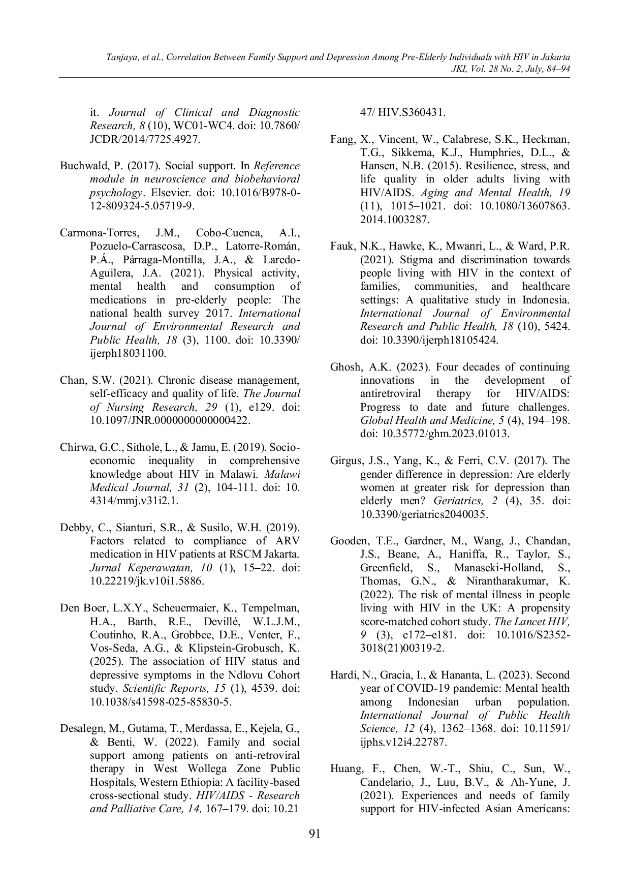 Jurnal Keperawatan IndonesiaJurnal Keperawatan IndonesiaDepresi pada pra-lansia dengan HIV dapat memengaruhi kualitas hidupnya. Keluarga dapat menjadi sumber dukungan utama bagi pra-lansia dan diketahui merupakan faktor protektif terhadap depresi. Maka dari itu, perlu dilakukan identifikasi terkait faktor protektif terhadap depresi agar pra-lansia dengan HIV dapat menua dengan baik. Penelitian ini bertujuan untuk melihat korelasi antara dukungan keluarga dengan depresi pada pra-lansia dengan HIV di Jakarta. Penelitian cross-sectional ini diikuti oleh 120 pra-lansia dengan HIV yang tergabung di Indonesia AIDS Coalition dan menerima pengobatan HIV di layanan kesehatan Jakarta dengan metode convenience sampling. Digunakan kuesioner karakteristik, kuesioner dukungan keluarga, dan DASS-21. Analisis data terdiri atas analisis univariat untuk melihat gambaran karakteristik, dukungan keluarga, dan depresi, sedangkan analisis bivariat untuk menguji korelasi menggunakan Spearman test. Pra-lansia dengan HIV menerima dukungan keluarga utamanya dari saudara kandung dan pasangan. Didapatkan bahwa partisipan mendapatkan dukungan keluarga yang relatif rendah (median 25,00) dan tingkat depresi yang ringan (median 8,00). Terdapat korelasi negatif yang signifikan dengan tingkat sedang antara dukungan keluarga dengan depresi pada pra-lansia dengan HIV di Jakarta (r = -0,344). Studi ini menunjukkan bahwa peningkatan dukungan keluarga pada pra-lansia dengan HIV dapat membantu menurunkan depresi. Dengan demikian, menjadi penting bagi tenaga kesehatan untuk melibatkan peran keluarga dalam tatalaksana pra-lansia dengan HIV. Melibatkan keluarga dalam perawatan pra-lansia dengan HIV perlu mendapat perhatian khusus untuk mengurangi depresi dan mendukung proses penuaan yang lebih sehat.