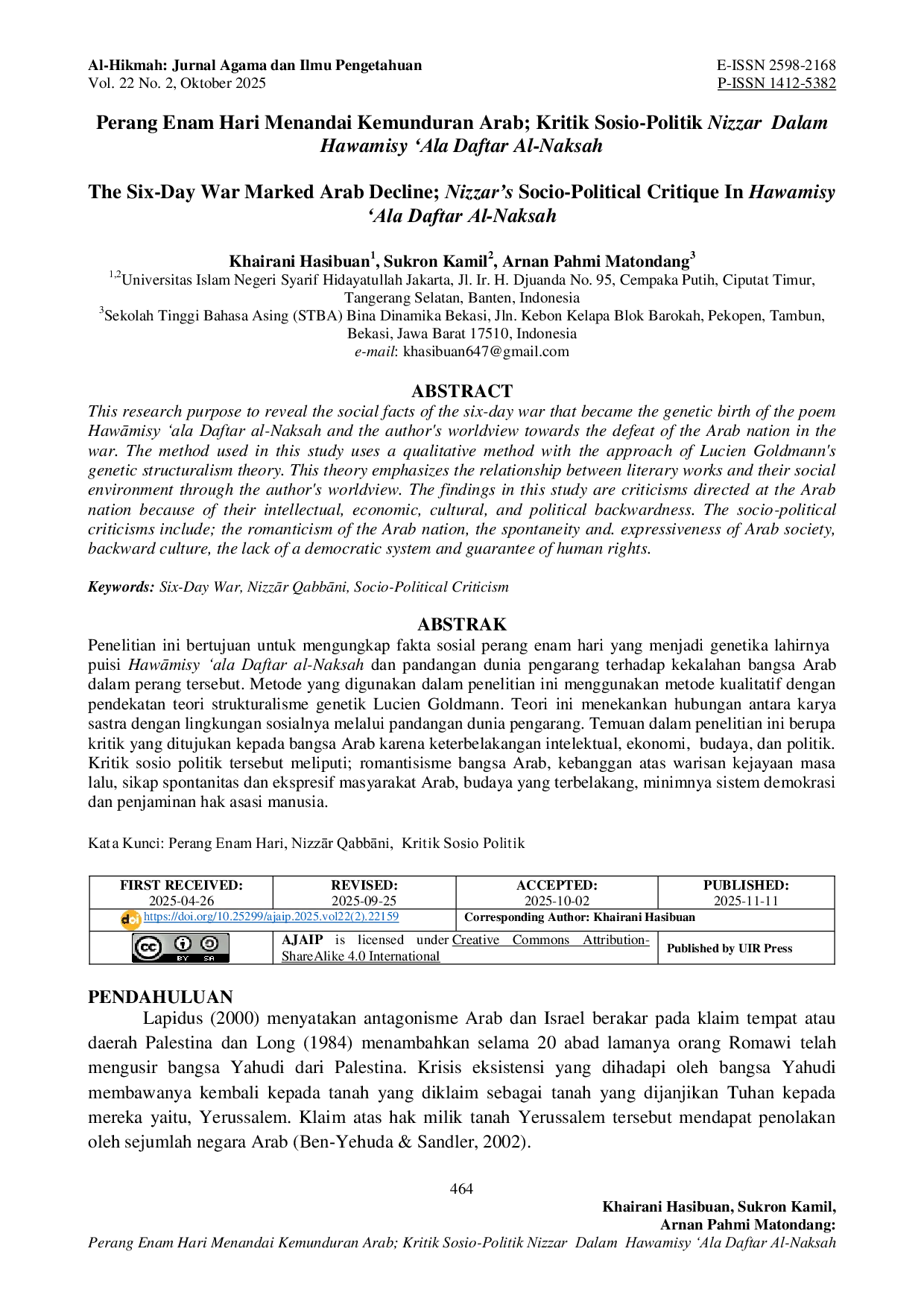 Al-Hikmah: Jurnal Agama dan Ilmu PengetahuanAl-Hikmah: Jurnal Agama dan Ilmu PengetahuanPenelitian ini bertujuan untuk mengungkap fakta sosial perang enam hari yang menjadi genetika lahirnya puisi Hawāmisy ala Daftar al-Naksah dan pandangan dunia pengarang terhadap kekalahan bangsa Arab dalam perang tersebut. Metode yang digunakan dalam penelitian ini menggunakan metode kualitatif dengan pendekatan teori strukturalisme genetik Lucien Goldmann. Teori ini menekankan hubungan antara karya sastra dengan lingkungan sosialnya melalui pandangan dunia pengarang. Temuan dalam penelitian ini berupa kritik yang ditujukan kepada bangsa Arab karena keterbelakangan intelektual, ekonomi, budaya, dan politik. Kritik sosio politik tersebut meliputi; romantisisme bangsa Arab, kebanggaan atas warisan kejayaan masa lalu, sikap spontanitas dan ekspresif masyarakat Arab, budaya yang terbelakang, minimnya sistem demokrasi dan penjaminan hak asasi manusia.