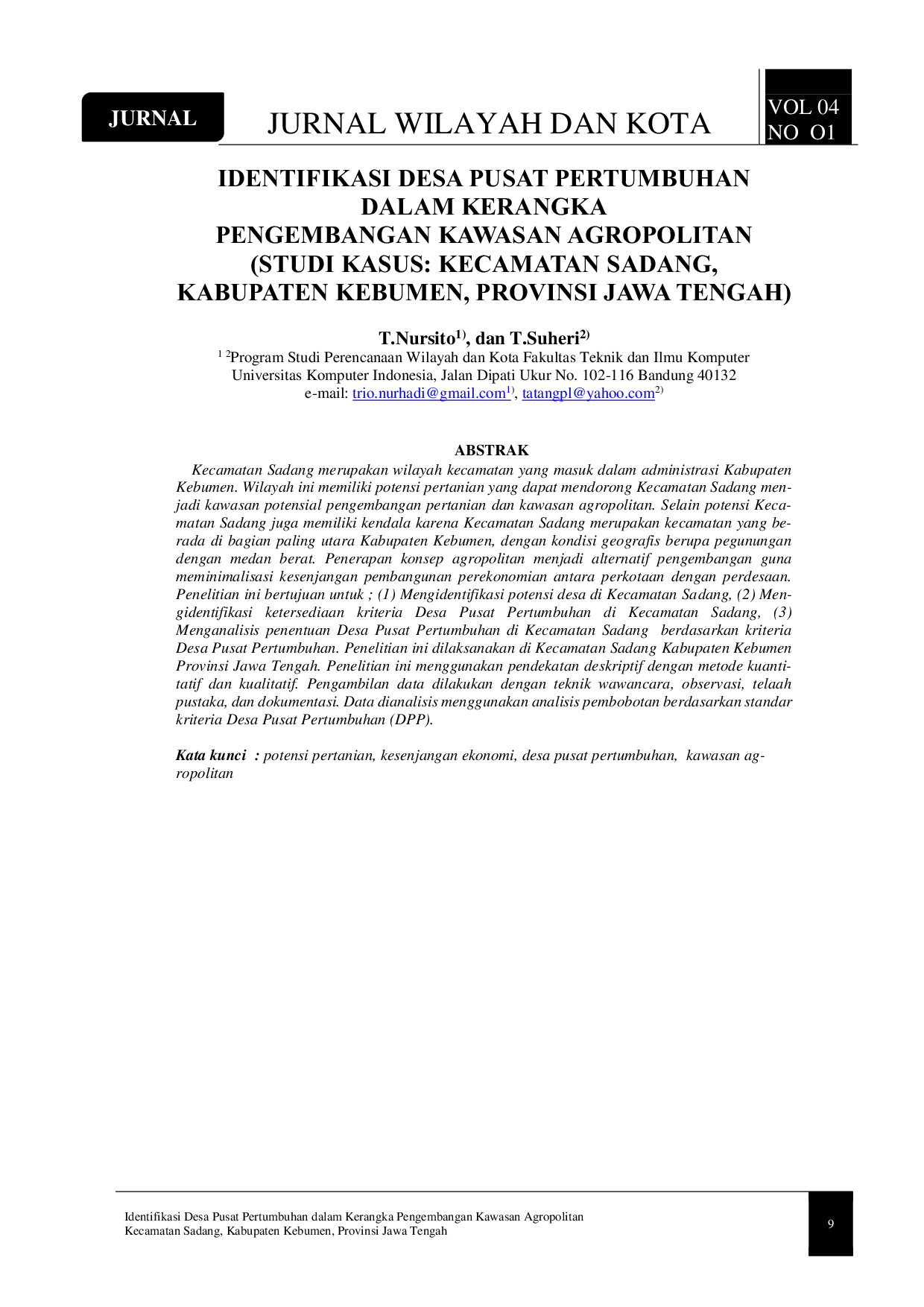 Jurnal Wilayah dan KotaJurnal Wilayah dan KotaKecamatan Sadang merupakan wilayah kecamatan yang masuk dalam administrasi Kabupaten Kebumen. Wilayah ini memiliki potensi pertanian yang dapat mendorong Kecamatan Sadang menjadi kawasan potensial pengembangan pertanian dan kawasan agropolitan. Selain potensi Kecamatan Sadang juga memiliki kendala karena Kecamatan Sadang merupakan kecamatan yang berada di bagian paling utara Kabupaten Kebumen, dengan kondisi geografis berupa pegunungan dengan medan berat. Penerapan konsep agropolitan menjadi alternatif pengembangan guna meminimalisasi kesenjangan pembangunan perekonomian antara perkotaan dengan perdesaan. Penelitian ini bertujuan untuk ; (1) Mengidentifikasi potensi desa di Kecamatan Sadang, (2) Mengidentifikasi ketersediaan kriteria Desa Pusat Pertumbuhan di Kecamatan Sadang, (3) Menganalisis penentuan Desa Pusat Pertumbuhan di Kecamatan Sadang berdasarkan kriteria Desa Pusat Pertumbuhan. Penelitian ini dilaksanakan di Kecamatan Sadang Kabupaten Kebumen Provinsi Jawa Tengah. Penelitian ini menggunakan pendekatan deskriptif dengan metode kuantitatif dan kualitatif. Pengambilan data dilakukan dengan teknik wawancara, observasi, telaah pustaka, dan dokumentasi. Data dianalisis menggunakan analisis pembobotan berdasarkan standar kriteria Desa Pusat Pertumbuhan (DPP).