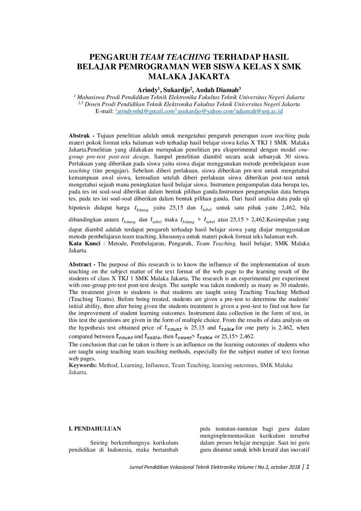 JURNAL PENDIDIKAN VOKASIONAL TEKNIK ELEKTRONIKA (JVoTE)JURNAL PENDIDIKAN VOKASIONAL TEKNIK ELEKTRONIKA (JVoTE)Tujuan penelitian adalah untuk mengetahui pengaruh penerapan team teaching pada materi pokok format teks halaman web terhadap hasil belajar siswa kelas X TKJ 1 SMK Malaka Jakarta. Penelitian yang dilakukan merupakan penelitian pra eksperimental dengan model one-group pre-test post-test design. Sampel penelitian diambil secara acak sebanyak 30 siswa. Perlakuan yang diberikan pada siswa yaitu siswa diajar menggunakan metode pembelajaran team teaching (tim pengajar). Sebelum diberi perlakuan, siswa diberikan pre-test untuk mengetahui kemampuan awal siswa, kemudian setelah diberi perlakuan siswa diberikan post-test untuk mengetahui sejauh mana peningkatan hasil belajar siswa. Instrumen pengumpulan data berupa tes, pada tes ini soal-soal diberikan dalam bentuk pilihan ganda. Dari hasil analisa data pada uji untuk satu pihak yaitu 2,462, bila hipotesis didapat harga yaitu 25,15 dan dibandingkan antara dan maka > atau 25,15 > 2,462. Kesimpulan yang dapat diambil adalah terdapat pengaruh terhadap hasil belajar siswa yang diajar menggunakan metode pembelajaran team teaching, khususnya untuk materi pokok format teks halaman web.