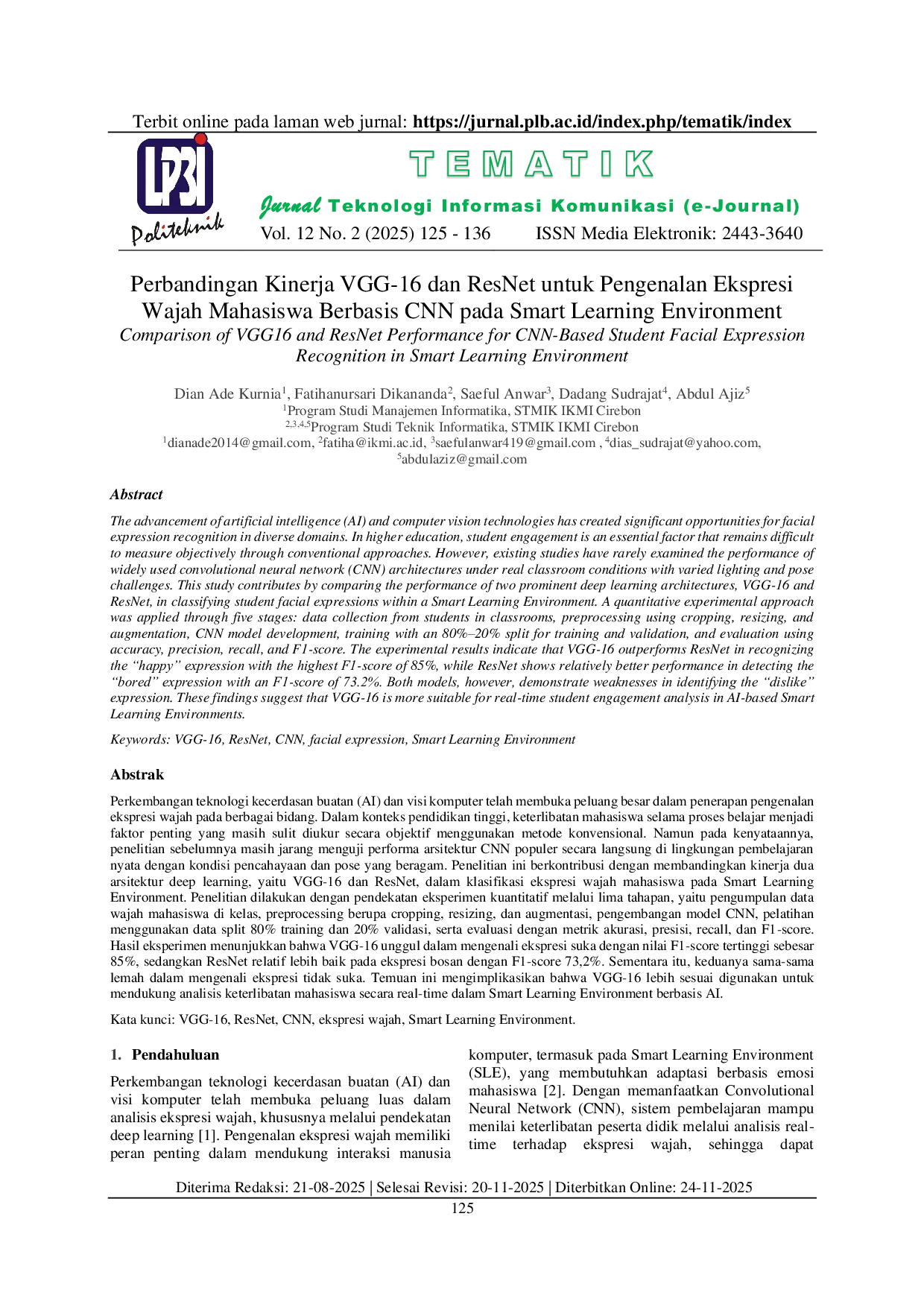 TEMATIKTEMATIKPerkembangan teknologi kecerdasan buatan (AI) dan visi komputer telah membuka peluang besar dalam penerapan pengenalan ekspresi wajah pada berbagai bidang. Dalam konteks pendidikan tinggi, keterlibatan mahasiswa selama proses belajar menjadi faktor penting yang masih sulit diukur secara objektif menggunakan metode konvensional. Penelitian ini berkontribusi dengan membandingkan kinerja dua arsitektur deep learning, yaitu VGG-16 dan ResNet, dalam klasifikasi ekspresi wajah mahasiswa pada Smart Learning Environment. Penelitian dilakukan dengan pendekatan eksperimen kuantitatif melalui lima tahapan, yaitu pengumpulan data wajah mahasiswa di kelas, preprocessing berupa cropping, resizing, dan augmentasi, pengembangan model CNN, pelatihan menggunakan data split 80% training dan 20% validasi, serta evaluasi dengan metrik akurasi, presisi, recall, dan F1-score. Hasil eksperimen menunjukkan bahwa VGG-16 unggul dalam mengenali ekspresi suka dengan nilai F1-score tertinggi sebesar 85%, sedangkan ResNet relatif lebih baik pada ekspresi bosan dengan F1-score 73,2%. Sementara itu, keduanya sama-sama lemah dalam mengenali ekspresi tidak suka. Temuan ini mengimplikasikan bahwa VGG-16 lebih sesuai digunakan untuk mendukung analisis keterlibatan mahasiswa secara real-time dalam Smart Learning Environment berbasis AI.