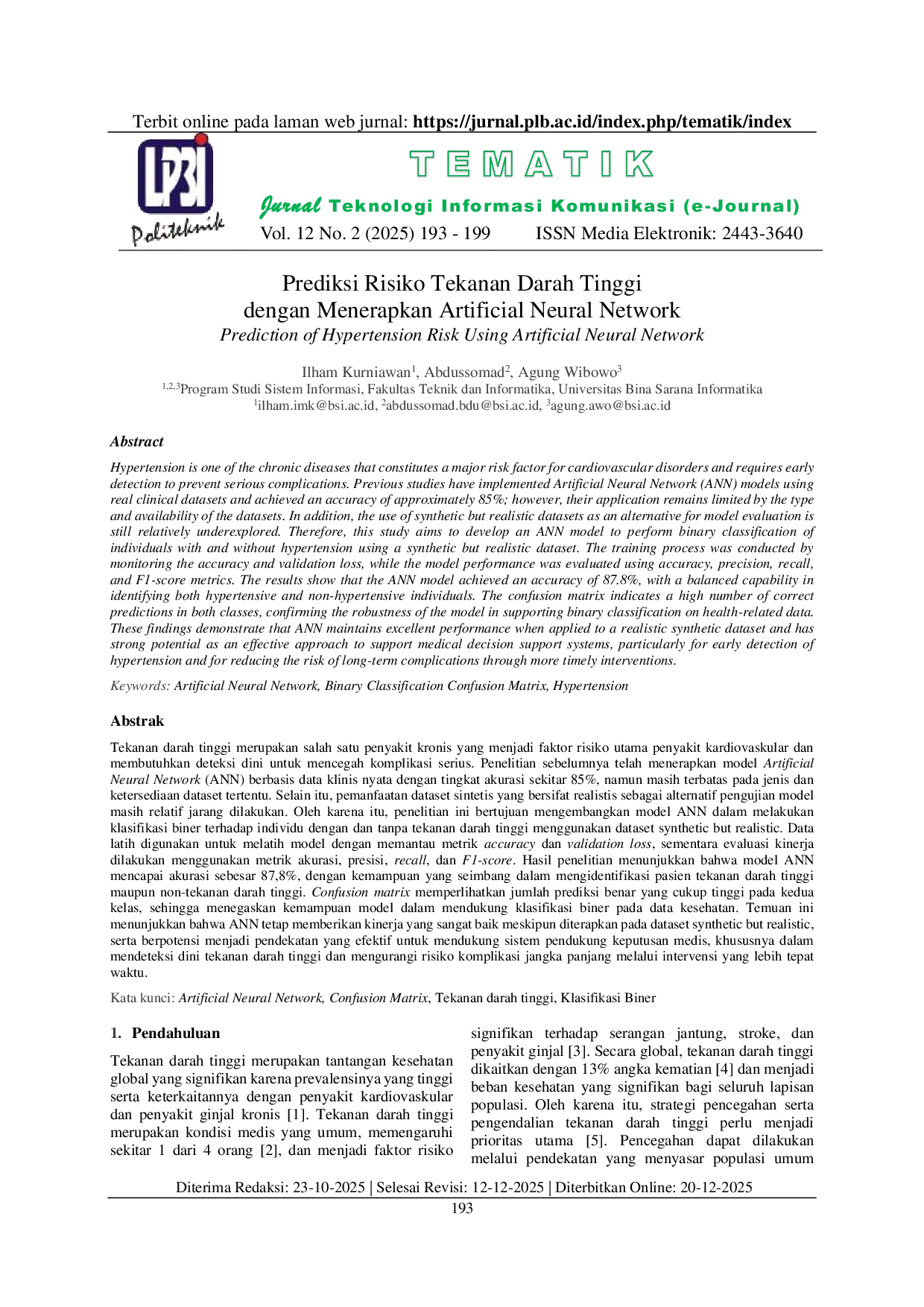 TEMATIKTEMATIKTekanan darah tinggi merupakan salah satu penyakit kronis yang menjadi faktor risiko utama penyakit kardiovaskular dan membutuhkan deteksi dini untuk mencegah komplikasi serius. Penelitian sebelumnya telah menerapkan model Artificial Neural Network (ANN) berbasis data klinis nyata dengan tingkat akurasi sekitar 85%, namun masih terbatas pada jenis dan ketersediaan dataset tertentu. Selain itu, pemanfaatan dataset sintetis yang bersifat realistis sebagai alternatif pengujian model masih relatif jarang dilakukan. Oleh karena itu, penelitian ini bertujuan mengembangkan model ANN dalam melakukan klasifikasi biner terhadap individu dengan dan tanpa tekanan darah tinggi menggunakan dataset synthetic but realistic. Data latih digunakan untuk melatih model dengan memantau metrik accuracy dan validation loss, sementara evaluasi kinerja dilakukan menggunakan metrik akurasi, presisi, recall, dan F1-score. Hasil penelitian menunjukkan bahwa model ANN mencapai akurasi sebesar 87,8%, dengan kemampuan yang seimbang dalam mengidentifikasi pasien tekanan darah tinggi maupun non-tekanan darah tinggi. Confusion matrix memperlihatkan jumlah prediksi benar yang cukup tinggi pada kedua kelas, sehingga menegaskan kemampuan model dalam mendukung klasifikasi biner pada data kesehatan. Temuan ini menunjukkan bahwa ANN tetap memberikan kinerja yang sangat baik meskipun diterapkan pada dataset synthetic but realistic, serta berpotensi menjadi pendekatan yang efektif untuk mendukung sistem pendukung keputusan medis, khususnya dalam mendeteksi dini tekanan darah tinggi dan mengurangi risiko komplikasi jangka panjang melalui intervensi yang lebih tepat waktu.