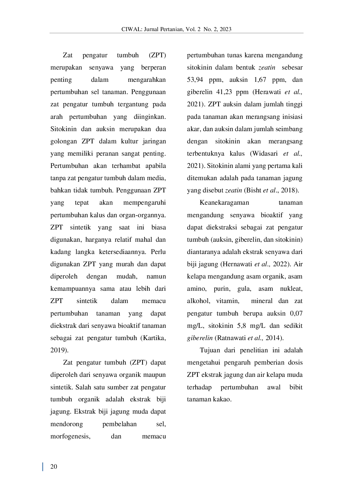 CIWAL: Jurnal PertanianCIWAL: Jurnal PertanianPenelitian ini bertujuan untuk mengetahui pengaruh pemberian dosis zat pengatur tumbuh (ZPT) alami ekstrak jagung dan air kelapa muda terhadap pertumbuhan awal bibit bibit tanaman kakao. Penelitian ini telah dilaksanakan pada bulan Mei sampai bulan Juli 2023 di Hombel Ruteng, Kecamatan Langke Rembong, Kabupaten Manggarai. Penelitian ini menggunakan Rancanagn Acak Kelompok (RAK) dengan 4 ulangan perlakuan yang dicobakan adalah dosis ZPT alami ekstrak jagung dan air kelapa muda terdiri dari 6 perlakuan yaitu: tanpa perlakuan (P0), dosis 40 mL/Polibag (P1), dosis 60 mL/Polibag (P2), dosis 100 mL/Polibag (P3), dosis 150 mL/Polibag (P4), dosis 200 mL/Polibag (P5), terdapat 24 unit percobaan sehingga pada unit penelitian ini memiliki 24 polibag sebagai media tanam. Parameter yang diamati adalah jumlah daun, diameter batang, panjang daun, dan bobot basah. Hasil penelitian pada perlakuan (P5) berpengaruh nyata terhadap jumlah daun (7.00 helai), panjang daun (9.05 cm), diameter batang (0.20 mm) dan bobot basah bibit tanaman kakao (4.00 g).