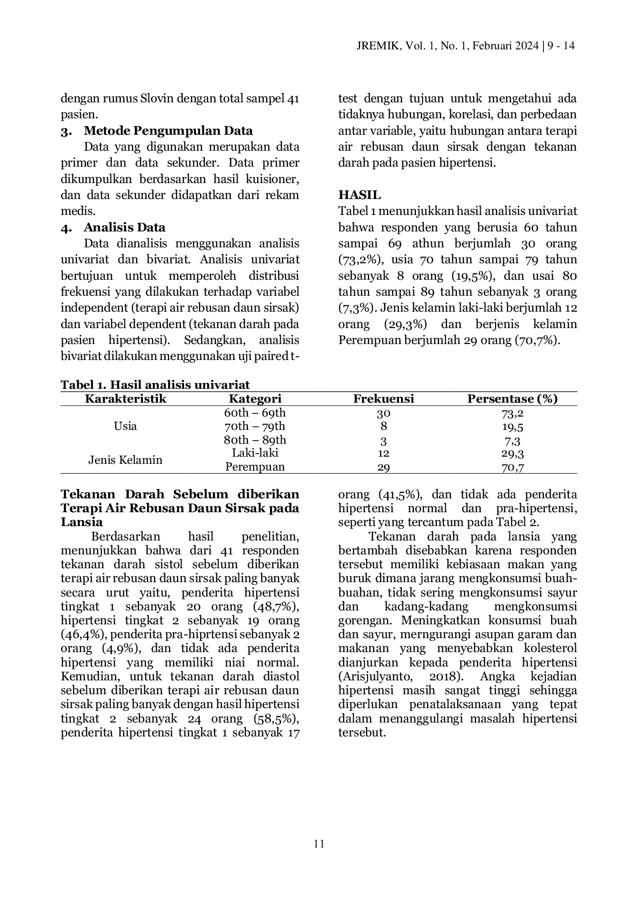 Jurnal Rekam Medis dan Informasi Kesehatan (JREMIK) E-ISSN:xxxx-xxxx P-ISSN:xxxx-xxxxJurnal Rekam Medis dan Informasi Kesehatan (JREMIK) E-ISSN:xxxx-xxxx P-ISSN:xxxx-xxxxHipertensi (tekanan darah tinggi) merupakan peningkatan tekanan darah sistolik dan diastolik. Daun sirsak memiliki antioksidan yang dapat menangkal radikal bebas, melenturkan dan melebarkan pembuluh darah serta menurunkan tekanan darah. Hipertensi mempengaruhi 22% populasi dunia dan menyumbang 36% kasus hipertensi di Asia Tenggara. Hipertensi juga merupakan salah satu penyebab kematian sebesar 23,7% dari 1,7 juta total kematian di Indonesia pada tahun 2016. Penelitian ini bertujuan untuk mengetahui pengaruh pemberian air rebusan daun sirsak terhadap penurunan tekanan darah pada lansia di Puskesmas Yosomulyo Kota Metro tahun 2023. Metode penelitian yang digunakan adalah penelitian kuantitatif pre-eksperimental dengan metode penelitian one group pretest & posttest. Populasi penelitian adalah seluruh lansia penderita hipertensi yang tinggal di wilayah kerja Puskesmas Yosomulyo dengan total sampel 41 pasien. Analisa data menggunakan uji Paired T-Test. Hasil penelitian menunjukkan bahwa rata-rata tekanan darah sistol dan diastol adalah 135,36/85,85 mmHg dengan penurunan darah sistol sebesar 19,0%mmHg dan diastol 14,6%mmHg. Kesimpulan penelitian ini adalah air rebusan daun sirsak memiliki hubungan yang signifikan terhadap penurunan tekanan darah pada lansia.