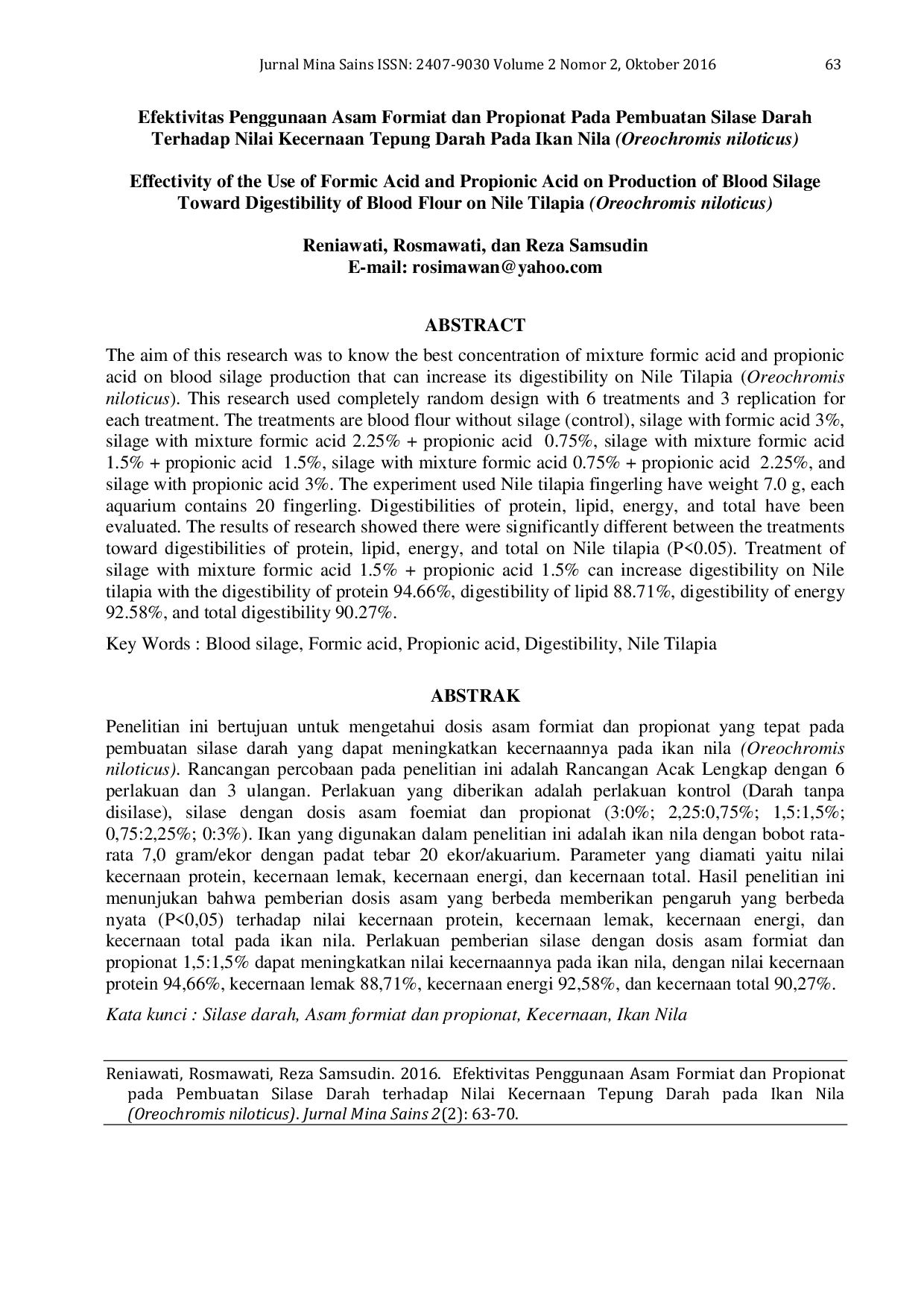 JURNAL MINA SAINSJURNAL MINA SAINSPenelitian ini bertujuan untuk mengetahui dosis asam formiat dan propionat yang tepat pada pembuatan silase darah yang dapat meningkatkan kecernaannya pada ikan nila (Oreochromis niloticus). Rancangan percobaan pada penelitian ini adalah Rancangan Acak Lengkap dengan 6 perlakuan dan 3 ulangan. Perlakuan yang diberikan adalah perlakuan kontrol (Darah tanpa disilase), silase dengan dosis asam foemiat dan propionat (3:0%; 2,25:0,75%; 1,5:1,5%; 0,75:2,25%; 0:3%). Ikan yang digunakan dalam penelitian ini adalah ikan nila dengan bobot rata-rata 7,0 gram/ekor dengan padat tebar 20 ekor/akuarium. Parameter yang diamati yaitu nilai kecernaan protein, kecernaan lemak, kecernaan energi, dan kecernaan total. Hasil penelitian ini menunjukan bahwa pemberian dosis asam yang berbeda memberikan pengaruh yang berbeda nyata (P<0,05) terhadap nilai kecernaan protein, kecernaan lemak, kecernaan energi, dan kecernaan total pada ikan nila. Perlakuan pemberian silase dengan dosis asam formiat dan propionat 1,5:1,5% dapat meningkatkan nilai kecernaannya pada ikan nila, dengan nilai kecernaan protein 94,66%, kecernaan lemak 88,71%, kecernaan energi 92,58%, dan kecernaan total 90,27%.