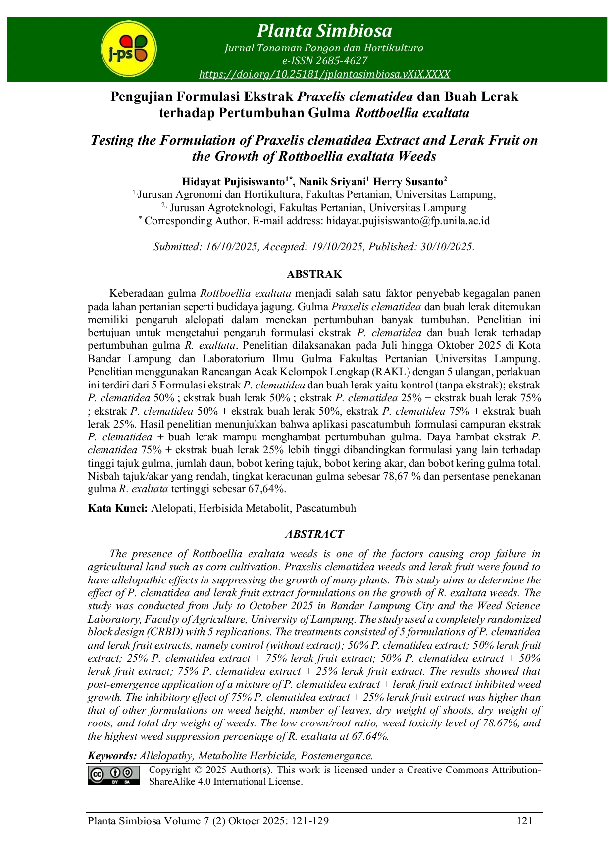 J-PlantasimbiosaJ-PlantasimbiosaKeberadaan gulma Rottboellia exaltata menjadi salah satu faktor penyebab kegagalan panen pada lahan pertanian seperti budidaya jagung. Gulma Praxelis clematidea dan buah lerak ditemukan memiliki pengaruh alelopati dalam menekan pertumbuhan banyak tumbuhan. Penelitian ini bertujuan untuk mengetahui pengaruh formulasi ekstrak P. clematidea dan buah lerak terhadap pertumbuhan gulma R. exaltata. Penelitian dilaksanakan pada Juli hingga Oktober 2025 di Kota Bandar Lampung dan Laboratorium Ilmu Gulma Fakultas Pertanian Universitas Lampung. Penelitian menggunakan Rancangan Acak Kelompok Lengkap (RAKL) dengan 5 ulangan, perlakuan ini terdiri dari 5 Formulasi ekstrak P. clematidea dan buah lerak yaitu kontrol (tanpa ekstrak); ekstrak P. clematidea 50% ; ekstrak buah lerak 50% ; ekstrak P. clematidea 25% ekstrak buah lerak 75% ; ekstrak P. clematidea 50% ekstrak buah lerak 50%, ekstrak P. clematidea 75% ekstrak buah lerak 25%. Hasil penelitian menunjukkan bahwa aplikasi pascatumbuh formulasi campuran ekstrak P. clematidea buah lerak mampu menghambat pertumbuhan gulma. Daya hambat ekstrak P. clematidea 75% ekstrak buah lerak 25% lebih tinggi dibandingkan formulasi yang lain terhadap tinggi tajuk gulma, jumlah daun, bobot kering tajuk, bobot kering akar, dan bobot kering gulma total. Nisbah tajuk/akar yang rendah, tingkat keracunan gulma sebesar 78,67 % dan persentase penekanan gulma R. exaltata tertinggi sebesar 67,64%.
