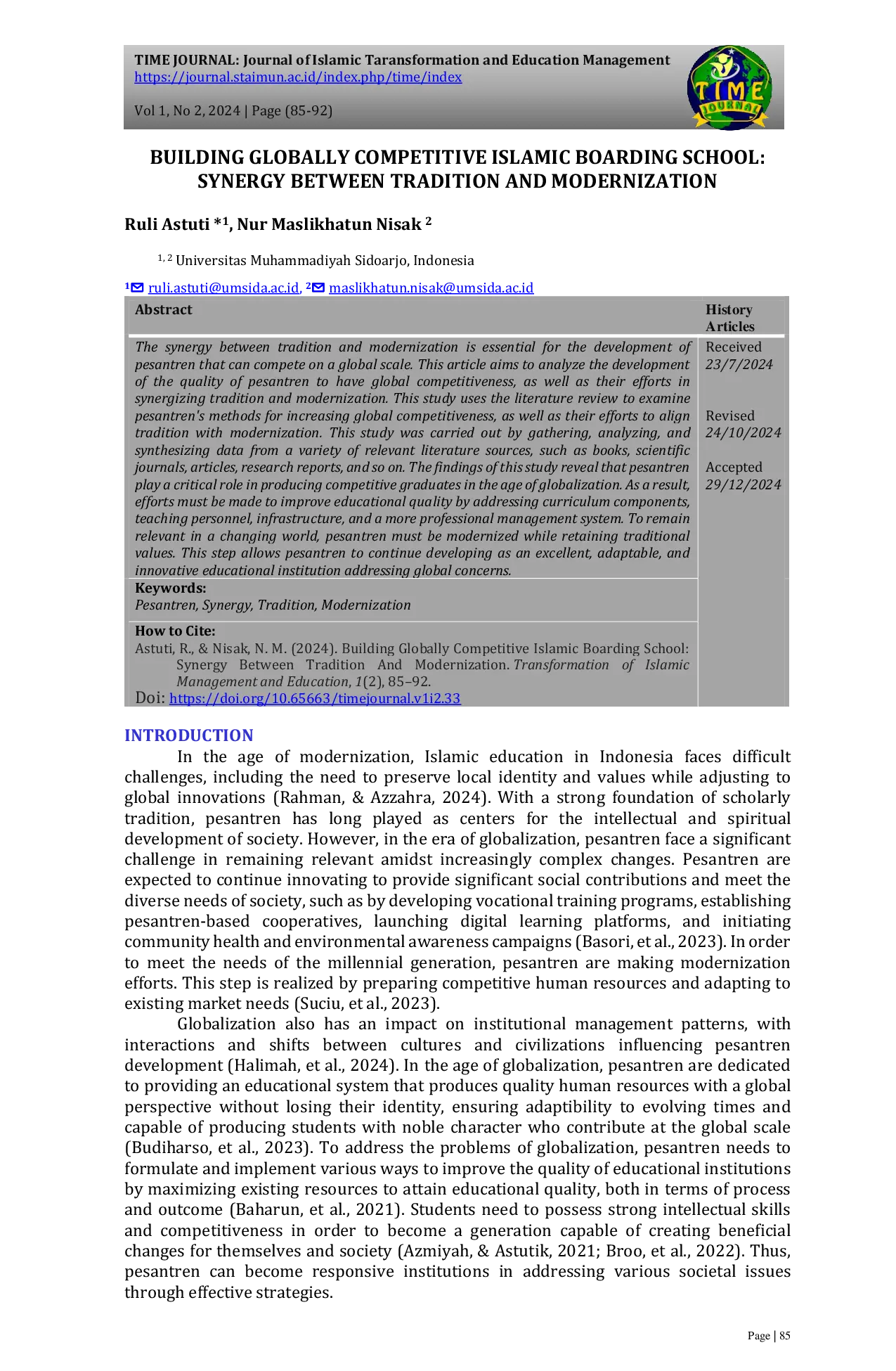TIME Journal: Transformation of Islamic Management and Education JournalTIME Journal: Transformation of Islamic Management and Education JournalThe synergy between tradition and modernization is essential for the development of pesantren that can compete on a global scale. This article aims to analyze the development of the quality of pesantren to have global competitiveness, as well as their efforts in synergizing tradition and modernization. This study uses the literature review to examine pesantrens methods for increasing global competitiveness, as well as their efforts to align tradition with modernization. This study was carried out by gathering, analyzing, and synthesizing data from a variety of relevant literature sources, such as books, scientific journals, articles, research reports, and so on. The findings of this study reveal that pesantren play a critical role in producing competitive graduates in the age of globalization. As a result, efforts must be made to improve educational quality by addressing curriculum components, teaching personnel, infrastructure, and a more professional management system. To remain relevant in a changing world, pesantren must be modernized while retaining traditional values. This step allows pesantren to continue developing as an excellent, adaptable, and innovative educational institution addressing global concerns.