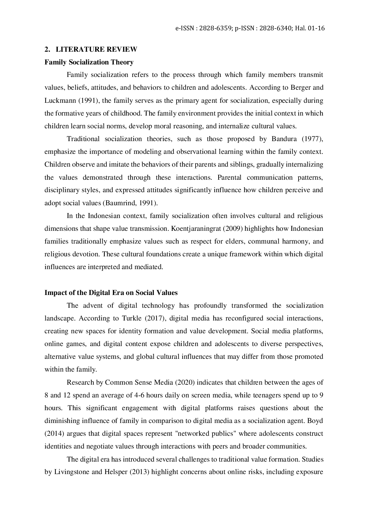 Penelitian ini menunjukkan bahwa keluarga tetap menjadi agen sosialisasi utama dalam era digital, namun keberhasilan pengaruhnya sangat tergantung pada kemampuan orang tua untuk menyesuaikan praktik sosialisasi tradisional dengan tantangan dan peluang digital.Pola komunikasi terbuka dan mediasi aktif terbukti meningkatkan internalisasi nilai keluarga, sedangkan pendekatan yang menekankan prinsip nilai umum mempersiapkan anak menghadapi situasi daring yang baru.Meskipun faktor sosioekonomi memengaruhi kapasitas mediasi digital, strategi penggunaan teknologi secara terarah dapat memperkuat peran keluarga dalam pembentukan nilai sosial.
