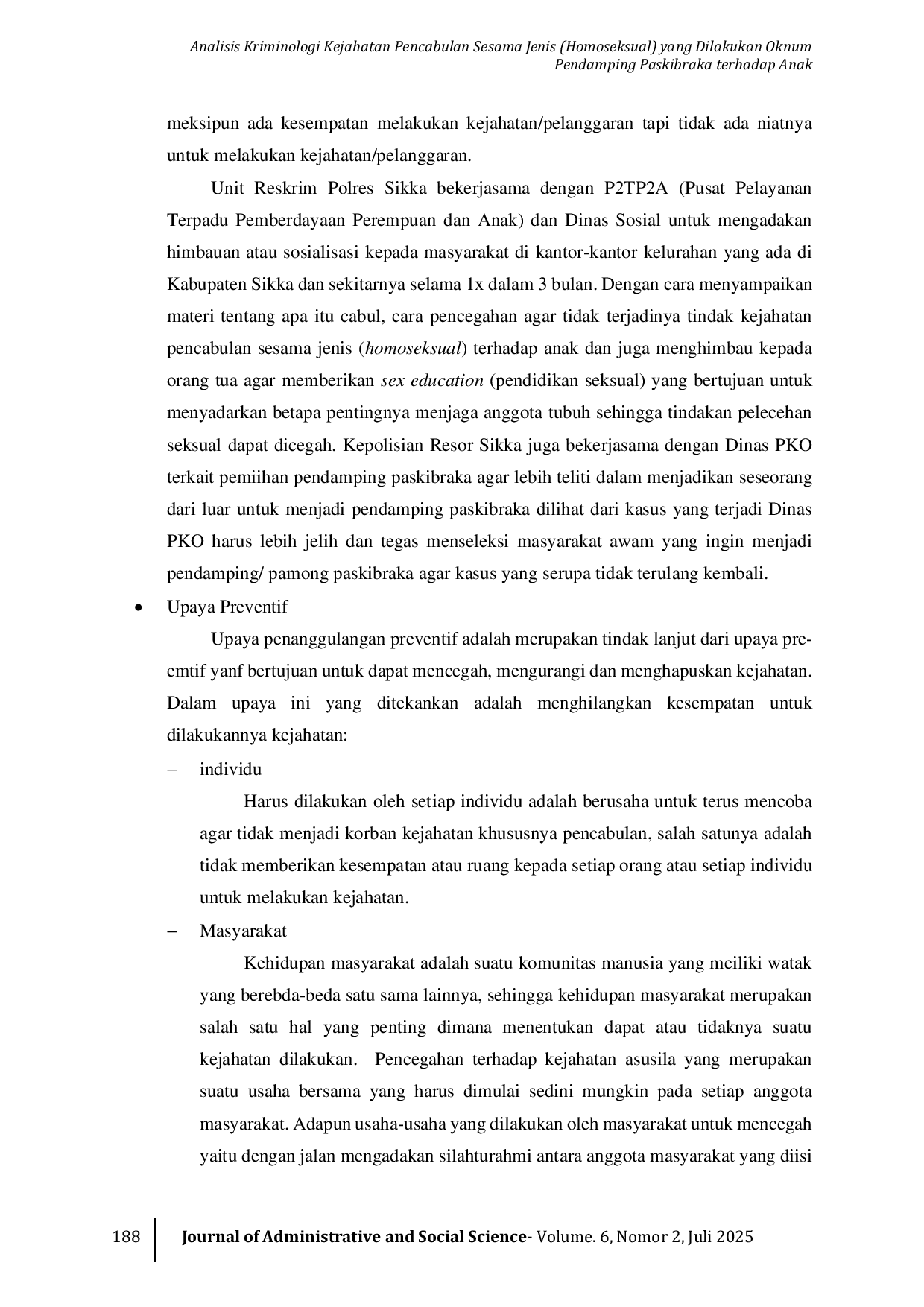 JOURNAL OF ADMINISTRATIVE AND SOCIAL SCIENCEJOURNAL OF ADMINISTRATIVE AND SOCIAL SCIENCEPencabulan sering didefinisikan dalam KUHP sebagai tindak pidana yang bertentangan dan melanggar kesopanan serta norma kesusilaan, yang semuanya dalam lingkungan nafsu birahi kelamin. Kejahatan pencabulan ini dapat menyimpang lebih jauh, di mana pelaku dan korban berjenis kelamin sama, yang disebut homoseksual. Penelitian ini menggunakan metode yuridis empiris. Hasil penelitian menunjukkan bahwa kejahatan pencabulan sesama jenis dipengaruhi oleh faktor orientasi seksual, faktor psikologis, dan faktor penyalahgunaan teknologi informasi dan komunikasi. Upaya penegakan hukum dilakukan melalui pendekatan pre-emtif, preventif, dan represif. Saran yang diajukan meliputi peningkatan peran keluarga dalam membentuk kepribadian, serta perbaikan ketentuan dalam KUHP dan Undang-Undang Perlindungan Anak dengan memperberat hukuman bagi pelaku kekerasan seksual terhadap anak.
