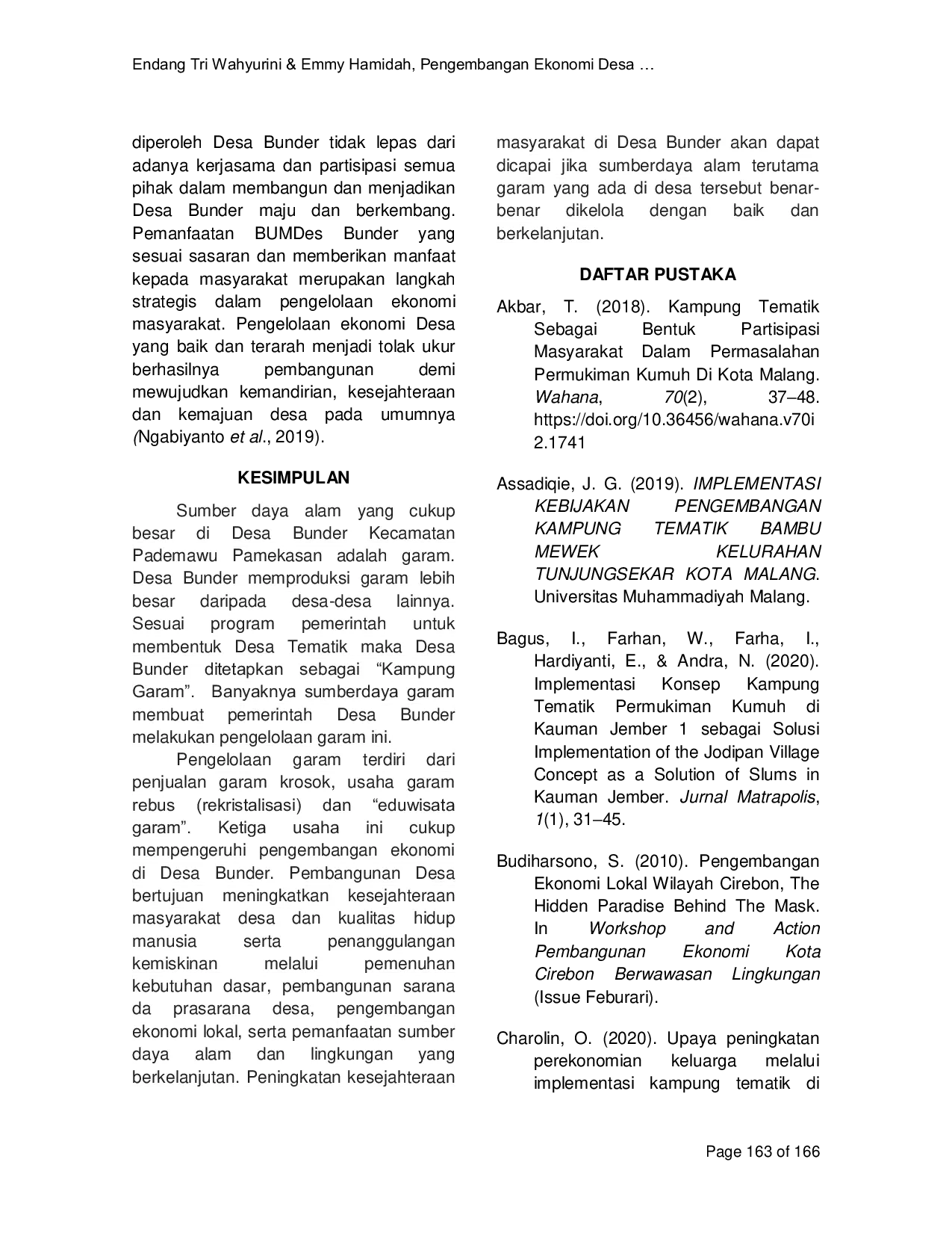 Jurnal Agrinika: Jurnal Agroteknologi dan AgribisnisJurnal Agrinika: Jurnal Agroteknologi dan AgribisnisTujuan penelitian ini adalah untuk mendapatkan gambaran dan menganalisis pola pengembangan ekonomi desa di Desa Bunder Kecamatan Pademawu Pamekasan. Penelitian menggunakan metode deskriptif analitis kualitatif. Penelitian ini menggambarkan bahwa Desa Bunder merupakan desa di pesisir dengan potensi garam yang cukup besar. Mayoritas masyarakatnya bermata pencaharian sebagai petani garam. Berdasarkan program Bupati Pamekasan untuk memudahkan dalam pengelolaan dan pengembangan ekonomi di desa perlu dibentuk desa tematik, pembentukan desa tematik ini berbasis potensi lokal wilayah tersebut. Oleh karena maka Desa Bunder ditetapkan sebagai “Kampung Garam. Kekayaan dan panorama garam yang indah di desa ini memberikan motivasi kepada masyarakat untuk membangun sebuah destinasi “Eduwisata Garam selain itu juga dilakukan usaha rekristalisasi garam dengan sistem garam rebus. Simpulan penelitian bahwa pengembangan ekonomi desa melalui kampung garam adalah sebagai bentuk pembangunan ekonomi yang berdaya saing.
