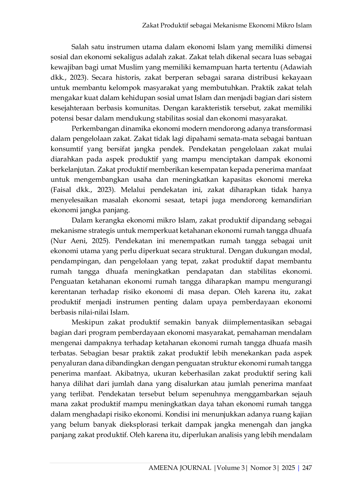 Ameena JournalAmeena JournalKetahanan ekonomi rumah tangga dhuafa merupakan isu penting dalam pembangunan ekonomi yang berkeadilan, khususnya dalam konteks masyarakat Muslim. Instrumen ekonomi Islam, seperti zakat, memiliki potensi besar dalam mendukung penguatan ekonomi kelompok rentan apabila dikelola secara produktif. Selama ini, zakat produktif telah banyak diterapkan sebagai bentuk pemberdayaan ekonomi, namun kajian yang menempatkannya sebagai mekanisme ekonomi mikro Islam yang terintegrasi masih relatif terbatas. Oleh karena itu, artikel ini bertujuan untuk mengkaji peran . Metode yang digunakan dalam penelitian ini adalah library research atau penelitian kepustakaan dengan menganalisis berbagai literatur yang relevan, meliputi buku, artikel jurnal, dan dokumen ilmiah yang membahas zakat produktif, ekonomi mikro Islam, serta ketahanan ekonomi rumah tangga. Data dianalisis secara deskriptif-analitis untuk mengidentifikasi pola, temuan, dan kesenjangan kajian yang ada. Hasil kajian menunjukkan bahwa zakat produktif memiliki potensi strategis dalam meningkatkan stabilitas pendapatan, keberlanjutan usaha, dan kemampuan adaptasi ekonomi rumah tangga dhuafa. Namun, sebagian besar kajian sebelumnya masih memposisikan zakat produktif sebagai program sosial, bukan sebagai bagian dari sistem ekonomi mikro Islam. Artikel ini menyimpulkan bahwa zakat produktif akan lebih efektif apabila dikelola secara terintegrasi dengan pendampingan usaha dan penguatan kapasitas ekonomi rumah tangga. Kontribusi penelitian ini terletak pada penguatan perspektif konseptual zakat produktif sebagai mekanisme ekonomi mikro Islam yang berorientasi pada ketahanan ekonomi rumah tangga dhuafa secara berkelanjutan.