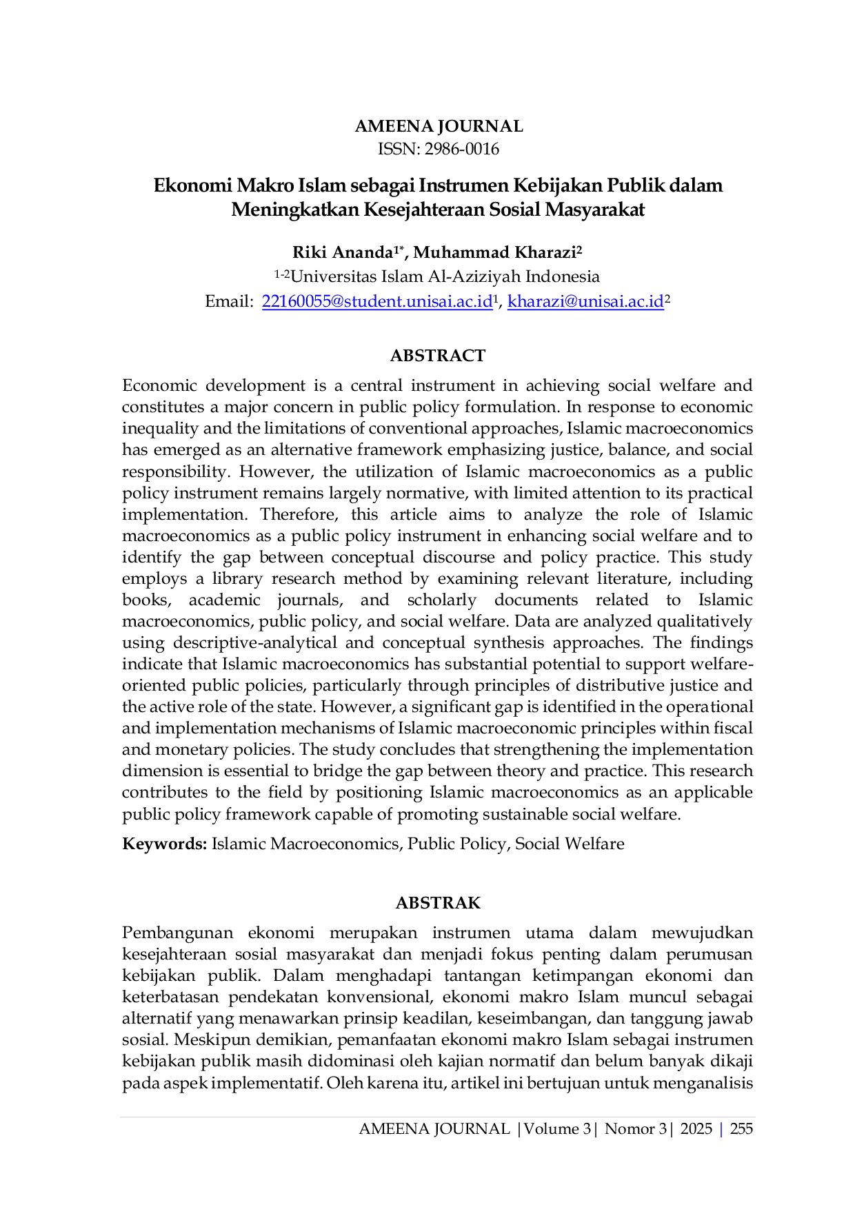 Ameena JournalAmeena JournalPembangunan ekonomi merupakan instrumen utama dalam mewujudkan kesejahteraan sosial masyarakat dan menjadi fokus penting dalam perumusan kebijakan publik. Dalam menghadapi tantangan ketimpangan ekonomi dan keterbatasan pendekatan konvensional, ekonomi makro Islam muncul sebagai alternatif yang menawarkan prinsip keadilan, keseimbangan, dan tanggung jawab sosial. Meskipun demikian, pemanfaatan ekonomi makro Islam sebagai instrumen kebijakan publik masih didominasi oleh kajian normatif dan belum banyak dikaji pada aspek implementatif. Oleh karena itu, artikel ini bertujuan untuk menganalisis peran serta mengidentifikasi kesenjangan antara konsep dan praktik kebijakan.