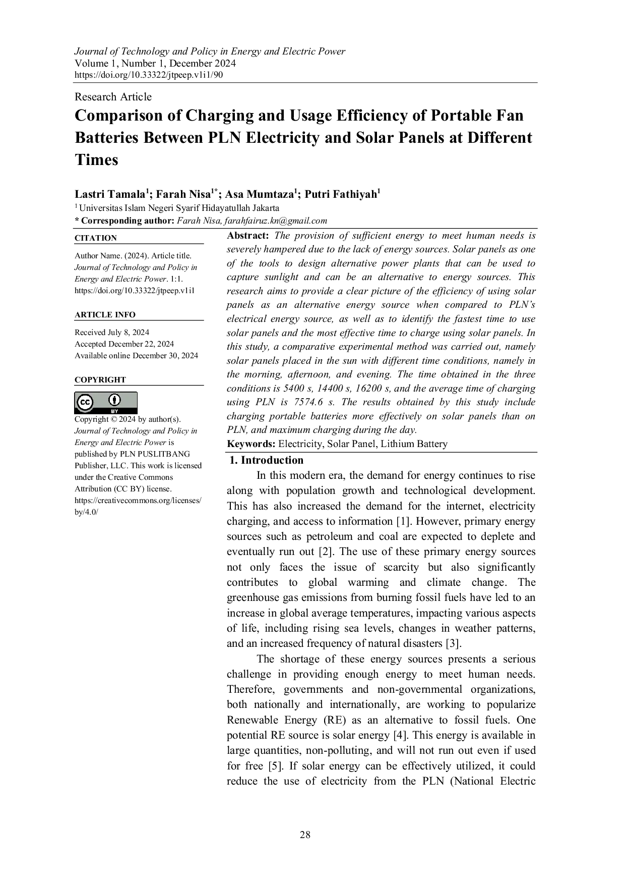 Based on the research findings, there is a difference in the duration of charging a portable fan battery using solar power and electricity from PLN.Charging using solar power is faster compared to using electricity from PLN, indicating higher effectiveness.The most effective time for charging using solar panels is during the day, as the charging time is significantly faster than in the morning or evening due to higher sunlight intensity.Therefore, utilizing solar power to charge a portable fan battery is best done during the day to ensure faster charging.