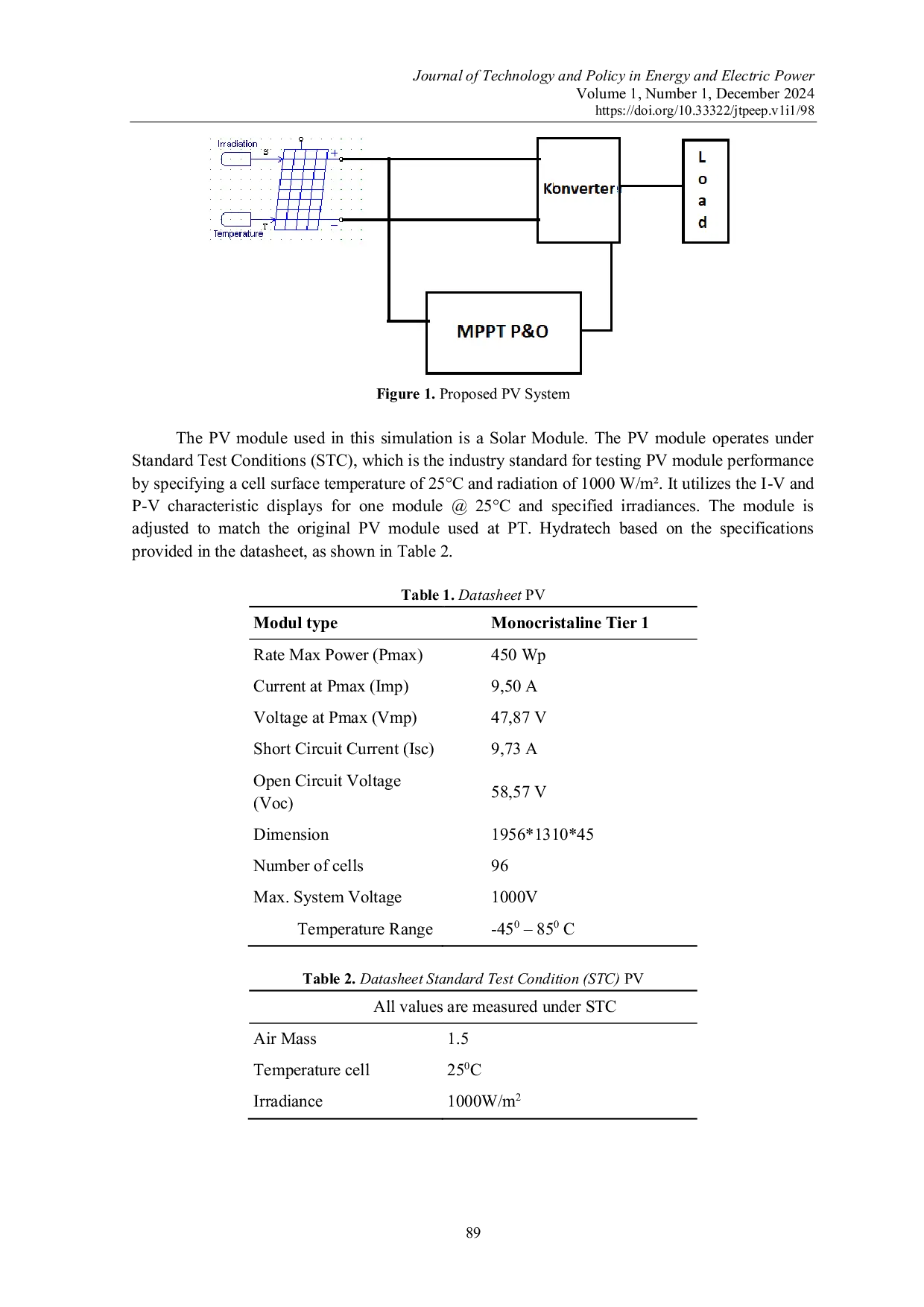 Journal of Technology and Policy in Energy and Electric PowerJournal of Technology and Policy in Energy and Electric PowerPT Hydratech Smart Indonesia adalah perusahaan yang telah mengimplementasikan teknologi PV surya atap untuk memenuhi kebutuhan daya listrik di sektor perkantoran skala kecil. Pemanfaatan PV surya atap dilakukan untuk mengurangi beban dari PLN dan untuk mengetahui seberapa besar keuntungan dalam hal efisiensi daya yang dihasilkan dalam penggunaan PV surya atap. Seperti teknologi energi terbarukan lainnya, tantangan yang dihadapi pembangkit listrik tenaga surya atap adalah fluktuasi matahari, dalam hal ini radiasinya, yang memiliki peran penting dalam proses ekstraksi daya output yang optimal. Perubahan radiasi yang cepat memengaruhi pemanfaatan energi surya menjadi energi listrik. Penelitian ini merancang pembangkit listrik tenaga surya atap yang optimal dari gedung PT Hydratech Smart Indonesia sebagai representasi penggunaan pembangkit listrik tenaga surya atap dengan kapasitas 3600 W dilengkapi dengan pelacakan titik daya maksimum (MPPT) untuk meningkatkan nilai daya output. Dari beberapa algoritma MPPT yang telah digunakan, algoritma perturb and observe (P&O) adalah algoritma yang paling populer karena implementasinya yang mudah dan harga yang ekonomis. Namun, kelemahan algoritma ini adalah efisiensi kinerjanya yang masih terbilang rendah sehingga perlu dimodifikasi nilai step size. Hasil penelitian menunjukkan bahwa menggunakan algoritma P&O konvensional, MPPT mampu mencapai efisiensi sebesar 81,19% dan algoritma P&O yang dimodifikasi sebesar 89,06%.