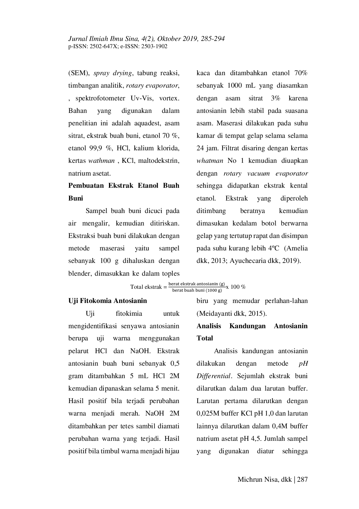JIIS (Jurnal Ilmiah Ibnu Sina): Ilmu Farmasi dan KesehatanJIIS (Jurnal Ilmiah Ibnu Sina): Ilmu Farmasi dan KesehatanBuah buni (Antidesma bunius L.) merupakan salah satu tanaman yang mengandung zat warna antosianin. Penelitian ini bertujuan untuk memformulasikan dan mengkarakterisasi mikrokapsul ekstrak buah buni yang mengandung antosianin dengan menggunakan metode spray drying. Bahan penyalut yang digunakan adalah maltodekstrin konsentrasi 5%, 7,5%, 10%. Ekstrak buah buni ditentukan kandungan total antosianin, dan mikrokapsul yang diperoleh dikarakterisasi secara organoleptik, mikroenkapsulasi efisiensi (MEE), morfologi partikel, dan distribusi ukuran partikel. Kandungan total antosianin dari ekstrak buah buni adalah 18,14 mg/100g. Mikrokapsul yang diperoleh dengan variasi konsentrasi maltodekstrin berwarna merah muda khas buah buni dengan berat 2,7 g, 3,3 g, 2,3 g, diperoleh nilai MEE (%) 50, 55, dan 59 berturut-turut, pada penampakan SEM bentuk spheries dan pada penggukuran PSA distribusi ukuran partikel 2,5µm, 2,1µm, 2,6µm.