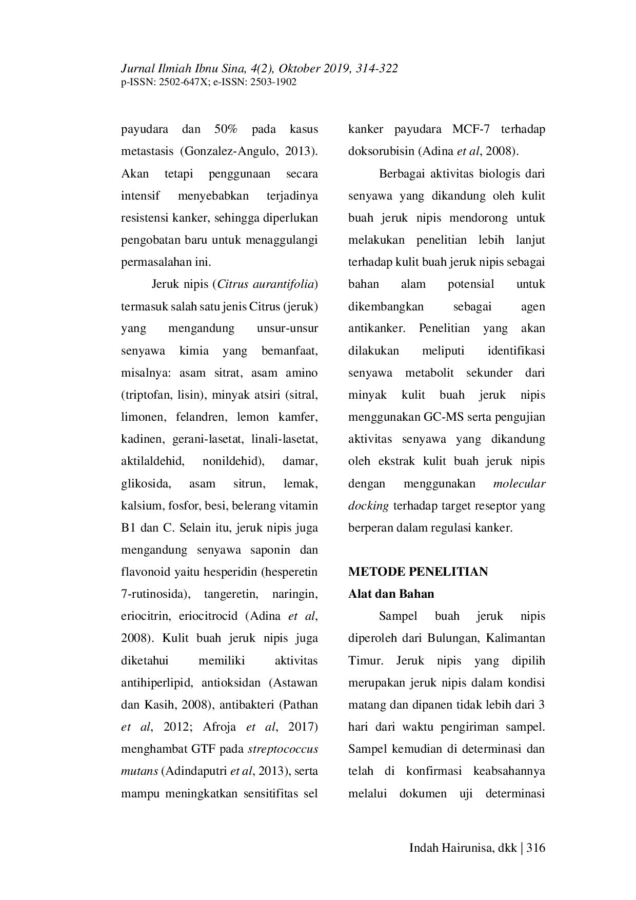 JIIS (Jurnal Ilmiah Ibnu Sina): Ilmu Farmasi dan KesehatanJIIS (Jurnal Ilmiah Ibnu Sina): Ilmu Farmasi dan KesehatanKanker merupakan penyakit penyebab kematian tertinggi di dunia. Penyakit ini diketahui memiliki regulasi yang berbeda dari penyakit lainnya. Pengembangan obat dewasa ini adalah dengan mentargetkan obat antikanker pada situs regulasi kanker yang ada pada hallmark of cancer. Jeruk nipis (Citrus aurantifolia) merupakan salah satu jenis Citrus (jeruk) yang mengandung unsur-unsur senyawa kimia yang memiliki aktivitas sebagai agen antikanker. Kulit jeruk nipis diketahui memiliki kandungan bioaktif berupa minyak atsiri dan flavonoid seperti hesperidin dan hesperitin. Kandungan senyawa ini erat hubungannya dengan aktivitas antikanker. Penelitian ini bertujuan untuk mengidentifikasi kandungan senyawa pada minyak kulit buah jeruk nipis dan kajian in silico molecular docking senyawa tersebut pada protein yang berperan dalam regulasi sel kanker. Minyak kulit buah jeruk nipis didapatkan dengan menggunakan metode distilasi uap kemudian dianalisis dengan menggunakan GC-MS untuk mengetahui komponen penyusunnya untuk selanjutnya dianalisis in silico menggunakan software YASARA 10.1.8, MarvinSketch 15.4.20, PLANTS. Hasil menunjukkan komponen utama minyak kulit buah jeruk nipis adalah senyawa d-limonen dan beta-pinen dengan persentase 59,71% dan 36,81%. Analisis in silico menunjukkan masing-masing senyawa ini memiliki afinitas yang lebih besar dari pada ligan native pada protein caspase-8 yang ada pada regulasi apoptosis. Berdasarkan hasil ini dapat disimpulkan, bahwa minyak kulit buah jeruk nipis memiliki potensi untuk dikembangkan sebagai agen antikanker.
