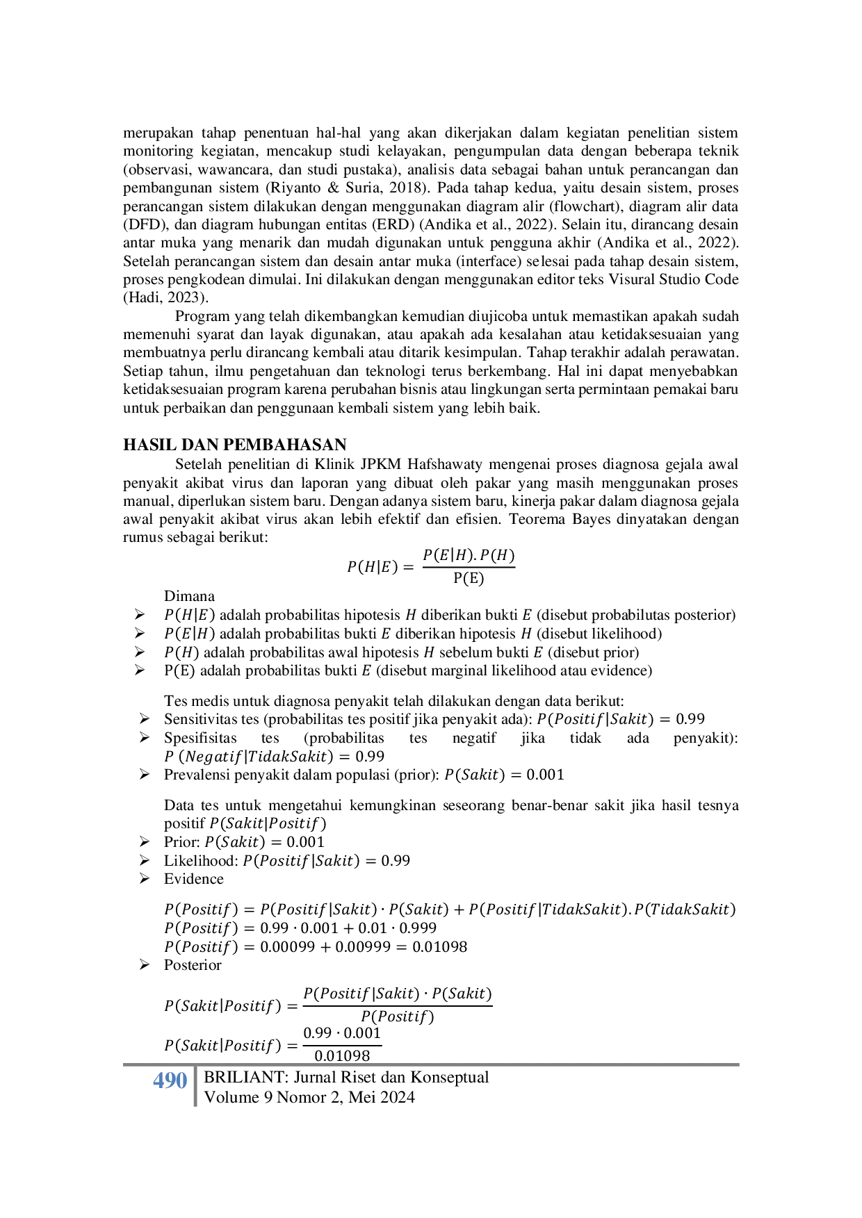 Briliant: Jurnal Riset dan KonseptualBriliant: Jurnal Riset dan KonseptualSistem pakar adalah aplikasi komputerisasi yang bertujuan untuk meniru proses penalaran seorang pakar dalam memecahkan masalah tertentu dan membuat keputusan atau kesimpulan karena pengetahuan mereka disimpan dalam basis pengetahuan untuk memproses pemecahan masalah. Dasar sistem pakar adalah bagaimana pengetahuan seorang pakar ditransfer ke komputer dan digunakan untuk membuat keputusan dan mengambil kesimpulan berdasarkan pengetahuan tersebut. Banyak aplikasi sistem pakar telah muncul di bidang kedokteran. Dengan menjawab pertanyaan pada aplikasi yang mirip dengan berkonsultasi ke dokter, sistem pakar ini memungkinkan orang awam mendeteksi penyakit berdasarkan gejala yang mereka alami. Dengan demikian, orang awam juga dapat mengidentifikasi penyakit dan solusi pengobatannya sejak dini, yang memungkinkan penanganan cepat dan pencegahan penyakit. Sistem ini bertujuan untuk memberikan dukungan kepada tenaga medis dalam melakukan diagnosa awal, meningkatkan akurasi diagnosa, serta membantu dalam pengambilan keputusan medis yang lebih cepat dan efisien. Penggunaan metode Teorema Bayes memungkinkan sistem untuk menangani ketidakpastian dan variasi dalam gejala yang dialami oleh pasien, sehingga mampu memberikan hasil yang lebih akurat.