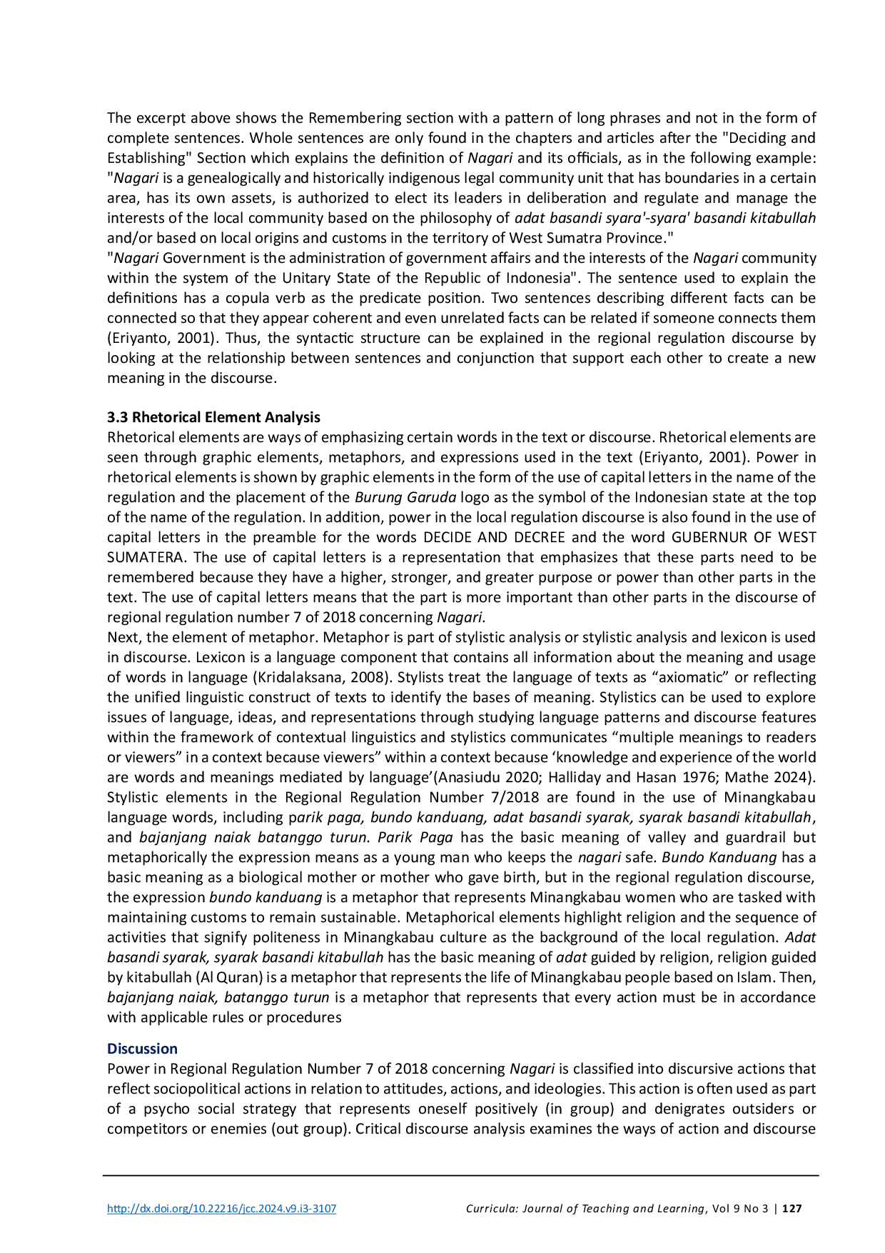 Curricula: Journal of Teaching and LearningCurricula: Journal of Teaching and LearningPenelitian ini mengkaji kekuasaan dalam Peraturan Daerah Provinsi Sumatra Barat Nomor 7 Tahun 2018 tentang Nagari dengan menggunakan Critical Discourse Analysis (CDA) van Dijk, khususnya analisis struktur teks. Studi CDA bersifat kualitatif deskriptif dengan metode observasi. Analisis bertujuan mengungkap kekuasaan tersembunyi di balik teks regulasi yang berfungsi membantu dan mengelola Pemerintahan Nagari di Sumatra Barat. Karena regulasi merupakan wacana institusional, ia termasuk dalam salah satu dari sembilan studi menarik perkembangan CDA. Hasil analisis menunjukkan adanya kekuasaan yang terkait dengan dominasi, ideologi, dan diskriminasi terhadap masyarakat Nagari. Penelitian ini memberikan implikasi bagi pelaksanaan kebijakan yang ada di masyarakat Nagari, di mana pemerintah sebagai pihak berkuasa mengatur komunitas Nagari tanpa memberikan ruang untuk mengekspresikan pendapat. Selain itu, urutan penomoran untuk mendefinisikan Bundo Kanduang dalam Pasal 1 ketentuan umum berada pada posisi terakhir, menandakan diskriminasi; penomoran tersebut berdampak pada peran Bundo Kanduang yang tidak diprioritaskan dalam masyarakat Minangkabau yang menganut sistem matrilineal.