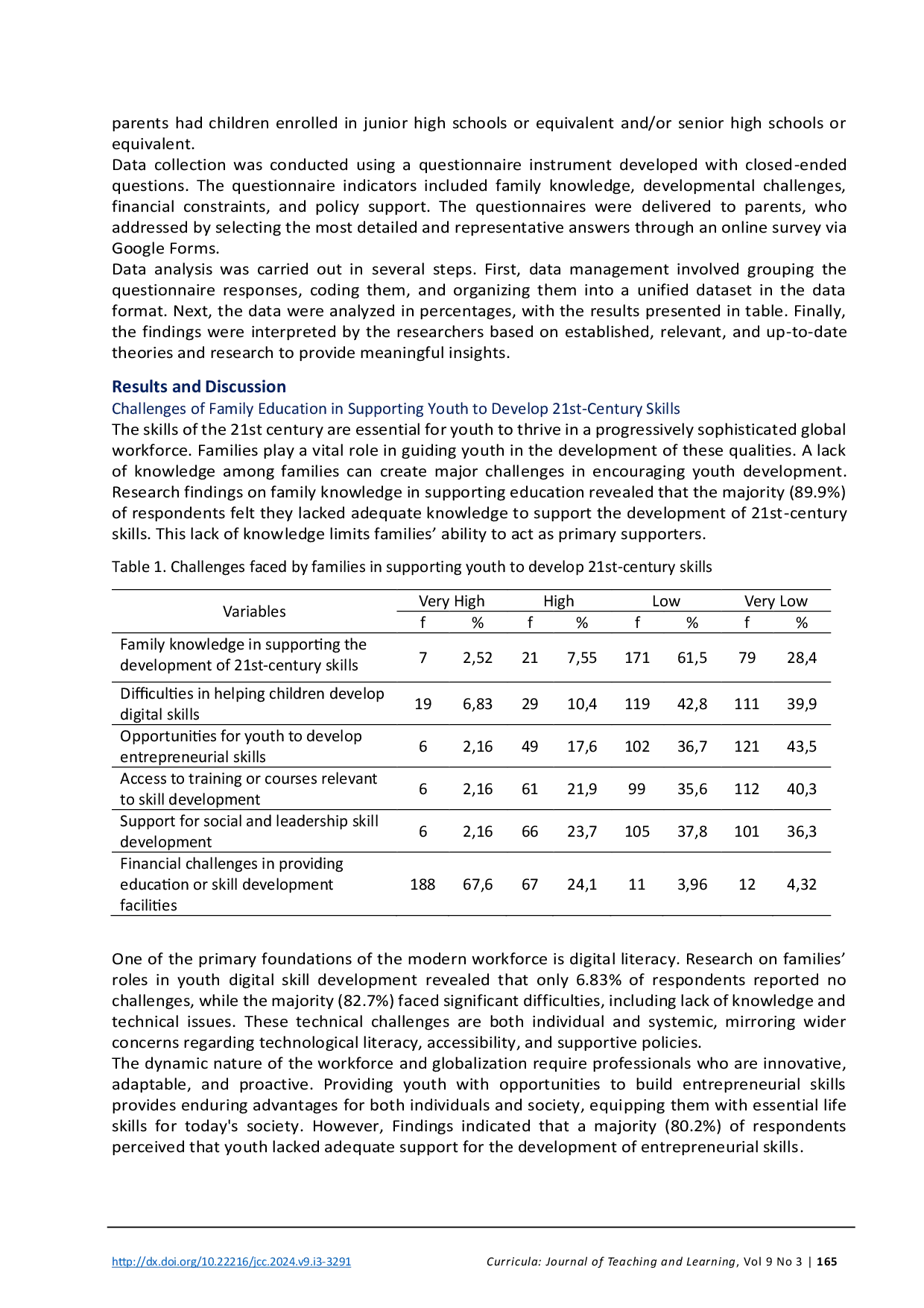 Curricula: Journal of Teaching and LearningCurricula: Journal of Teaching and LearningThis study aims to understand the challenges faced by families in instilling character and supporting the development of 21st-century skills among youth. Using a descriptive quantitative approach, respondents were parents with children enrolled in secondary schools or equivalent in Maros Regency, South Sulawesi. The findings indicate that families have not yet fully optimized their role as primary supporters in building a young generation ready to face global challenges. Difficulties in supporting digital skills, a lack of role models at home, and negative influences from external factors such as social media are key issues. Families struggle to provide opportunities for relevant skill training, leading to low readiness among youth to compete in the era of globalization. This study underscores the importance of improving family literacy in character education and 21st-century skills. Practical training-based interventions for families and policies that enhance access to training, along with strengthened synergy between families, schools, and communities, are identified as strategic solutions.