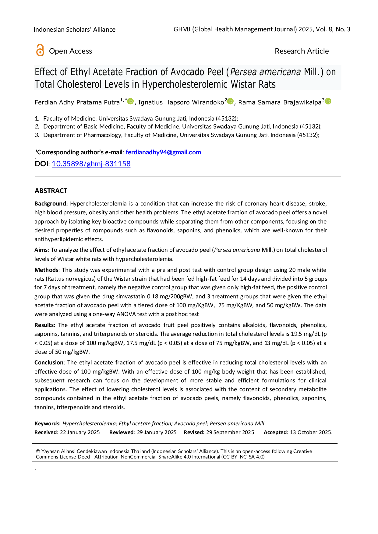 GHMJ (Global Health Management Journal)GHMJ (Global Health Management Journal)Hyperkolesterolemia adalah kondisi yang dapat meningkatkan risiko penyakit jantung koroner, stroke, hipertensi, obesitas, dan masalah kesehatan lainnya. Fraksi asetat etil kulit alpukat menawarkan pendekatan baru dengan mengisolasi senyawa bioaktif kunci dan memisahkan mereka dari komponen lainnya, dengan fokus pada sifat-sifat senyawa yang diinginkan seperti flavonoid, saponin, dan fenolik yang dikenal memiliki efek antihiperlipidemia.