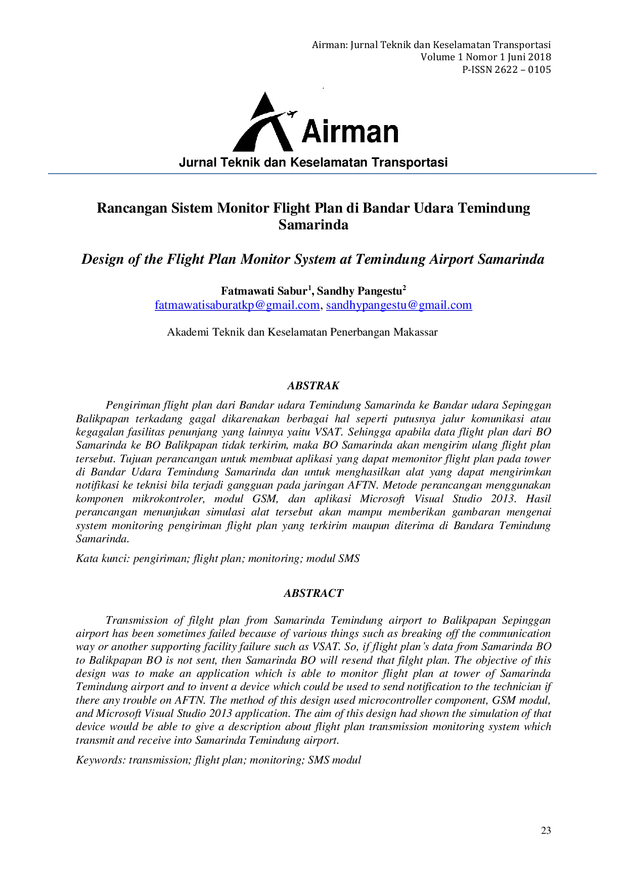 Airman: Jurnal Teknik dan Keselamatan TransportasiAirman: Jurnal Teknik dan Keselamatan TransportasiPengiriman flight plan dari Bandar udara Temindung Samarinda ke Bandar udara Sepinggan Balikpapan terkadang gagal karena berbagai hal seperti putusnya jalur komunikasi atau kegagalan fasilitas penunjang seperti VSAT. Jika data flight plan tidak terkirim, BO Samarinda akan mengirim ulang. Tujuan perancangan ini adalah membuat aplikasi untuk memonitor flight plan di tower Bandar Udara Temindung Samarinda dan menghasilkan alat yang dapat mengirimkan notifikasi ke teknisi jika terjadi gangguan pada jaringan AFTN. Metode perancangan menggunakan mikrokontroler, modul GSM, dan aplikasi Microsoft Visual Studio 2013. Hasil perancangan menunjukkan simulasi alat tersebut mampu memberikan gambaran mengenai sistem monitoring pengiriman flight plan yang terkirim maupun diterima di Bandar Udara Temindung Samarinda.