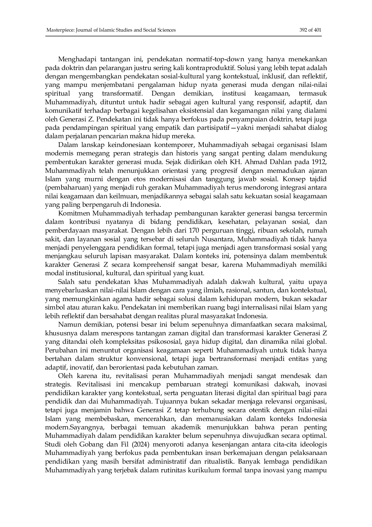 Masterpiece: Journal of Islamic Studies and Social SciencesMasterpiece: Journal of Islamic Studies and Social SciencesPenelitian ini bertujuan untuk mengeksplorasi secara mendalam peran organisasi keagamaan Muhammadiyah dalam penguatan karakter Generasi Z di tengah tantangan era digital dan disrupsi nilai. Fenomena melemahnya internalisasi nilai keislaman di kalangan generasi muda, khususnya mereka yang lahir dalam ekosistem digital, menjadi latar belakang penting dari studi ini. Menggunakan pendekatan kualitatif berbasis studi literatur naratif, penelitian ini menelaah narasi sosial, ideologis, dan kultural yang terkandung dalam dokumen akademik, laporan kelembagaan, dan teks dakwah Muhammadiyah yang diterbitkan dalam rentang 2020–2025. Teknik pengumpulan data dilakukan melalui studi dokumenter sistematis yang diperoleh dari jurnal ilmiah, buku, pidato resmi, dan hasil penelitian relevan lainnya, yang dipilih secara purposive dan diperluas melalui teknik snowball literature tracking. Analisis data dilakukan dengan pendekatan tematik menggunakan model Miles dan Huberman, meliputi proses reduksi data, penyajian, dan verifikasi. Temuan utama menunjukkan tiga tema kunci: (1) relevansi nilai keagamaan dengan realitas digital Generasi Z, (2) pentingnya revitalisasi pendidikan karakter berbasis komunitas, dan (3) hambatan ideologis-institusional dalam internalisasi nilai. Penelitian ini berkontribusi pada pemahaman teoritis tentang pentingnya pendekatan naratif-partisipatif dalam pendidikan karakter keagamaan yang kontekstual, serta menawarkan implikasi praktis bagi pengembangan kurikulum dakwah digital dan kebijakan pembinaan generasi muda di lingkungan Muhammadiyah. Studi ini juga menyarankan perlunya penelitian lanjutan dengan pendekatan etnografi digital untuk menggali lebih jauh praktik keberagamaan generasi muda di ruang virtual.
