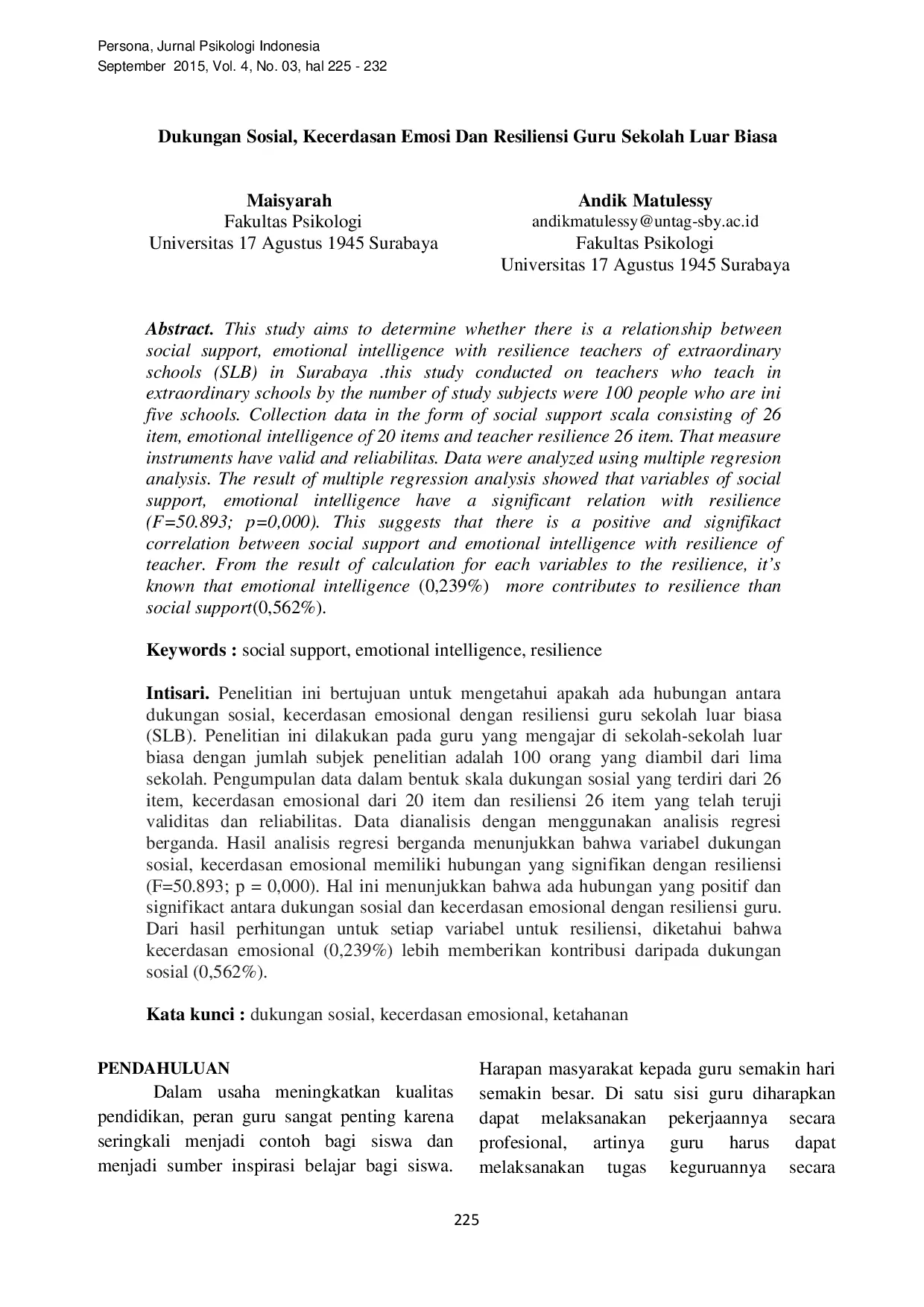 Hasil penelitian menunjukkan bahwa dukungan sosial dan kecerdasan emosi secara bersama-sama berkorelasi sangat signifikan dengan resiliensi guru.Dukungan sosial berkorelasi positif sangat signifikan dengan resiliensi guru, sedangkan kecerdasan emosi juga berkorelasi positif terhadap resiliensi.Hipotesis yang menyatakan adanya hubungan positif antara dukungan sosial dan kecerdasan emosi dengan resiliensi guru dapat diterima.