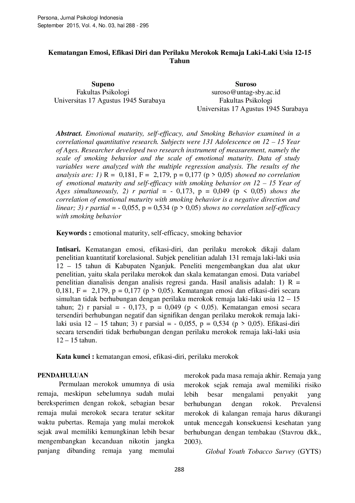 Kematangan emosi dan efikasi-diri tidak dapat memprediksi perilaku merokok remaja laki-laki usia 12–15 tahun.Kematangan emosi memiliki hubungan negatif dengan perilaku merokok, sementara efikasi-diri tidak terkait signifikan.Semakin matang emosi, semakin kecil risiko merokok, dan sebaliknya.