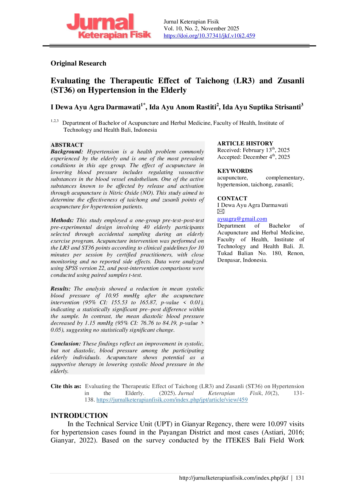 Jurnal Keterapian FisikJurnal Keterapian FisikLatar belakang: Hipertensi adalah masalah kesehatan yang umum dialami oleh lansia dan merupakan salah satu kondisi paling prevalen pada kelompok usia ini. Efek akupunktur dalam menurunkan tekanan darah meliputi regulasi zat vasoaktif di endotel pembuluh darah. Salah satu zat aktif yang diketahui dipengaruhi oleh pelepasan dan aktivasi melalui akupunktur adalah Nitric Oxide (NO). Penelitian ini bertujuan untuk menentukan efektivitas titik taichong dan zusanli akupunktur pada pasien hipertensi.