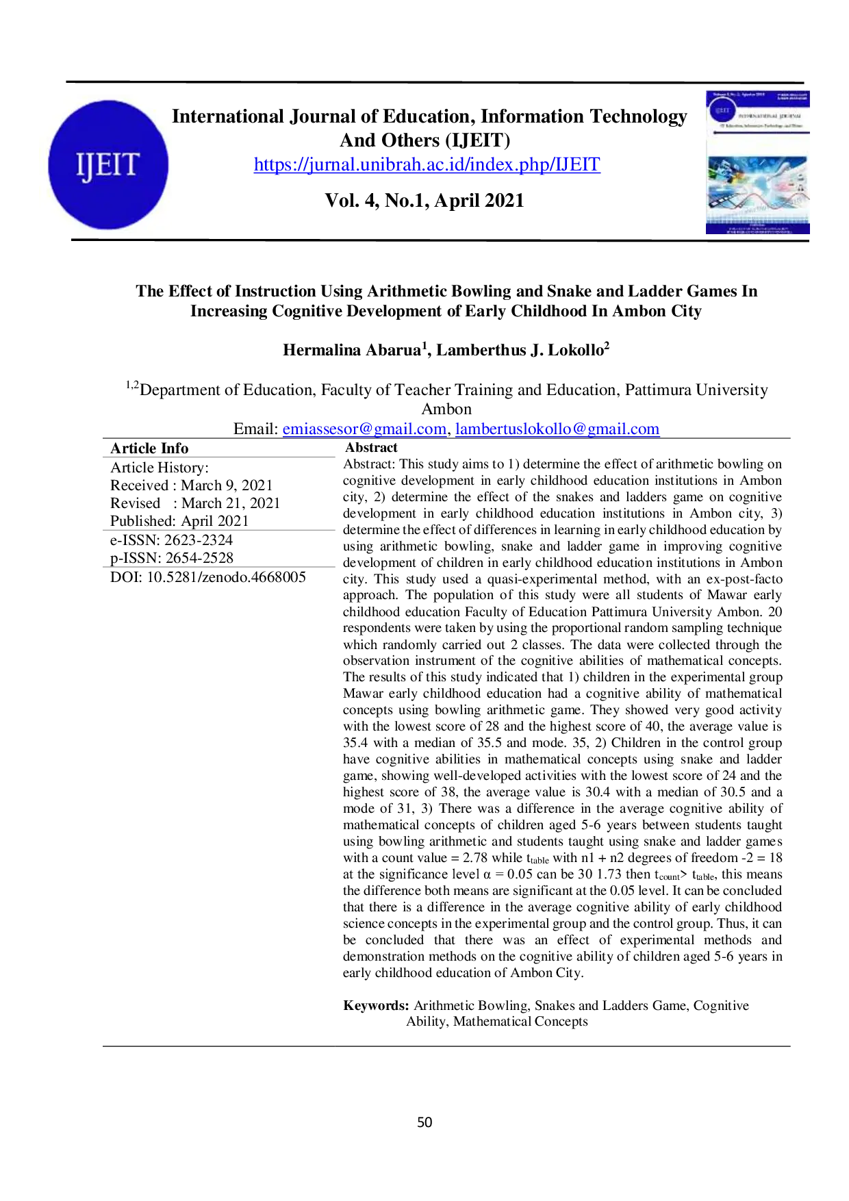 International Journal of Education, Information Technology, and OthersInternational Journal of Education, Information Technology, and OthersPenelitian ini bertujuan untuk: (1) mengetahui pengaruh bowling aritmatika terhadap perkembangan kognitif pada pendidikan anak usia dini di Kota Ambon, (2) mengetahui pengaruh permainan ular tangga terhadap perkembangan kognitif pada pendidikan anak usia dini di Kota Ambon, (3) mengetahui perbedaan hasil belajar pada pendidikan anak usia dini dengan menggunakan bowling aritmatika, permainan ular tangga dalam meningkatkan perkembangan kognitif anak pada pendidikan anak usia dini di Kota Ambon. Penelitian ini menggunakan metode quasi-eksperimen dengan pendekatan ex-post-facto. Populasi penelitian ini adalah seluruh siswa Pendidikan Anak Usia Dini Mawar Fakultas Keguruan dan Ilmu Pendidikan Universitas Pattimura Ambon. Responden sebanyak 20 orang diambil dengan teknik sampling proporsional random yang dilakukan secara acak 2 kelas. Data dikumpulkan melalui instrumen observasi kemampuan kognitif konsep matematika. Hasil penelitian ini menunjukkan bahwa: (1) anak pada kelompok eksperimen Pendidikan Anak Usia Dini Mawar memiliki kemampuan kognitif konsep matematika dengan menggunakan permainan bowling aritmatika. Mereka menunjukkan aktivitas sangat baik dengan skor terendah 28 dan skor tertinggi 40, nilai rata-rata 35,4 dengan median 35,5 dan modus 35, (2) anak pada kelompok kontrol memiliki kemampuan kognitif konsep matematika dengan menggunakan permainan ular tangga, menunjukkan aktivitas berkembang dengan baik dengan skor terendah 24 dan skor tertinggi 38, nilai rata-rata 30,4 dengan median 30,5 dan modus 31, (3) terdapat perbedaan rata-rata kemampuan kognitif konsep matematika anak usia 5-6 tahun antara siswa yang diajar menggunakan bowling aritmatika dan siswa yang diajar menggunakan permainan ular tangga dengan nilai hitung = 2,78 sedangkan t tabel dengan derajat bebas n1 n2 -2 = 18 pada taraf signifikan α = 0,05 didapatkan 30 1,73 maka t hitung> t tabel, ini berarti perbedaan kedua rata-rata signifikan pada taraf 0,05. Dapat disimpulkan bahwa terdapat perbedaan rata-rata kemampuan kognitif konsep sains anak usia dini pada kelompok eksperimen dan kelompok kontrol. Sehingga, dapat disimpulkan bahwa terdapat pengaruh metode eksperimental dan metode demonstrasi terhadap kemampuan kognitif anak usia 5-6 tahun pada pendidikan anak usia dini Kota Ambon.
