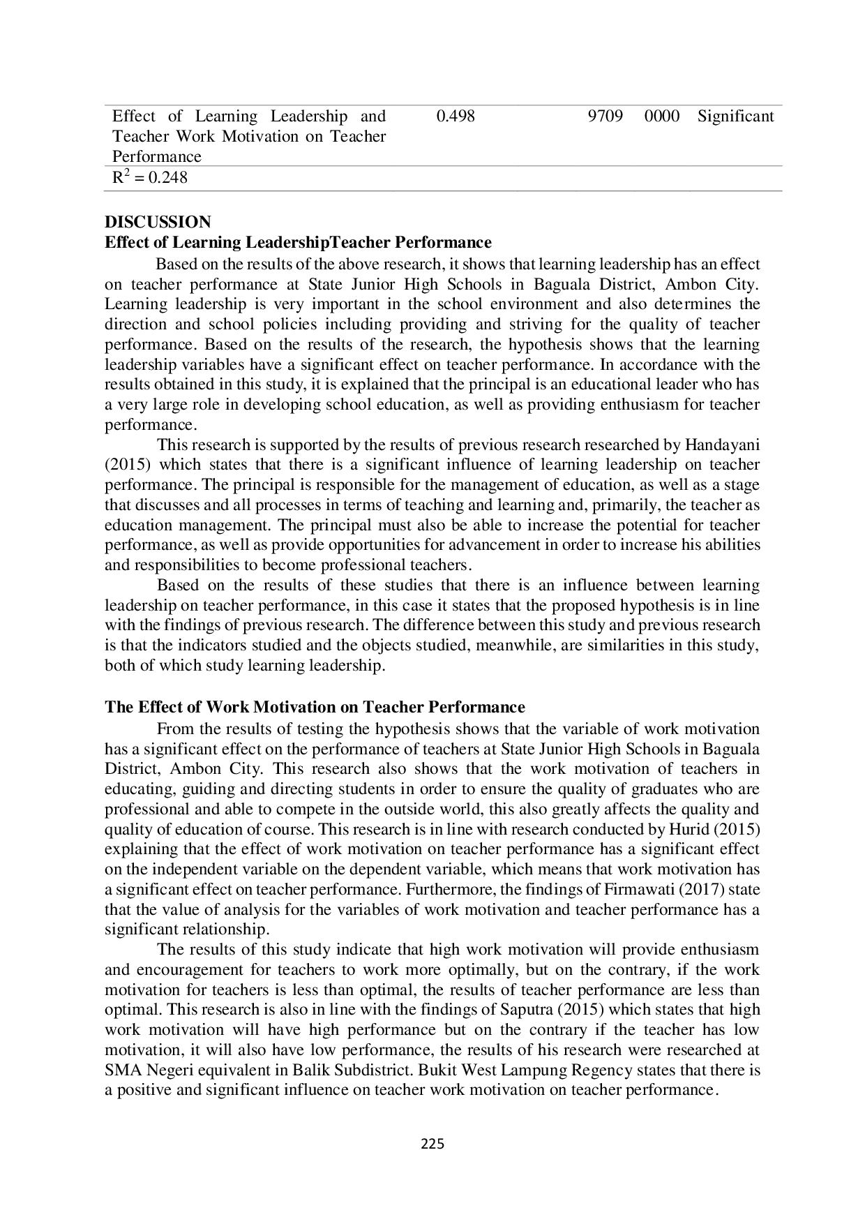 Kepemimpinan pembelajaran memiliki pengaruh signifikan terhadap kinerja guru di SMP Negeri Kecamatan Baguala, Ambon.Motivasi kerja berkontribusi signifikan terhadap peningkatan kinerja guru.Kombinasi kepemimpinan pembelajaran dan motivasi kerja secara bersamaan berdampak signifikan terhadap peningkatan kinerja guru.