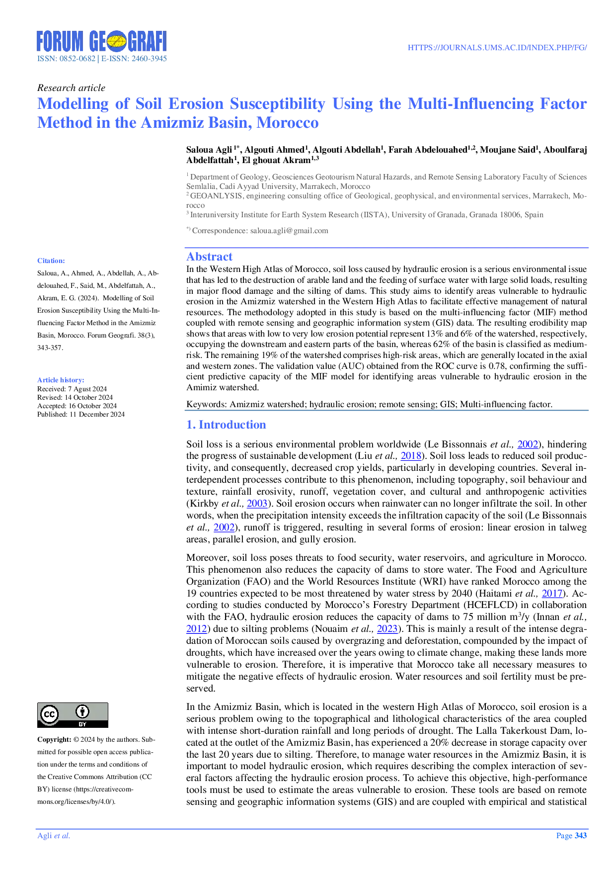 Forum GeografiForum GeografiDi Pegunungan Tinggi Barat Maroko, hilangnya tanah akibat erosi hidrolik adalah masalah lingkungan serius yang telah menyebabkan kerusakan lahan pertanian dan pemberian beban padatan besar ke air permukaan, mengakibatkan kerusakan banjir yang signifikan dan pengendapan bendungan. Studi ini bertujuan untuk mengidentifikasi area yang rentan terhadap erosi hidrolik di daerah aliran sungai Amizmiz di Pegunungan Tinggi Barat untuk memfasilitasi manajemen sumber daya alam yang efektif. Metode yang digunakan dalam studi ini berbasis metode faktor pengaruh multi (MIF) yang dikombinasikan dengan data penginderaan jauh dan sistem informasi geografis (GIS). Peta erodibilitas yang dihasilkan menunjukkan bahwa area dengan potensi erosi rendah hingga sangat rendah masing-masing mencakup 13% dan 6% dari daerah aliran, berada di bagian hilir dan timur basin, sedangkan 62% dari basin diklasifikasikan sebagai risiko menengah. Sisa 19% daerah aliran terdiri dari area berisiko tinggi, yang umumnya terletak di zona axial dan barat. Nilai validasi (AUC) yang diperoleh dari kurva ROC adalah 0,78, mengonfirmasi kemampuan prediktif yang cukup baik dari model MIF untuk mengidentifikasi area yang rentan terhadap erosi hidrolik di daerah aliran Amizmiz.