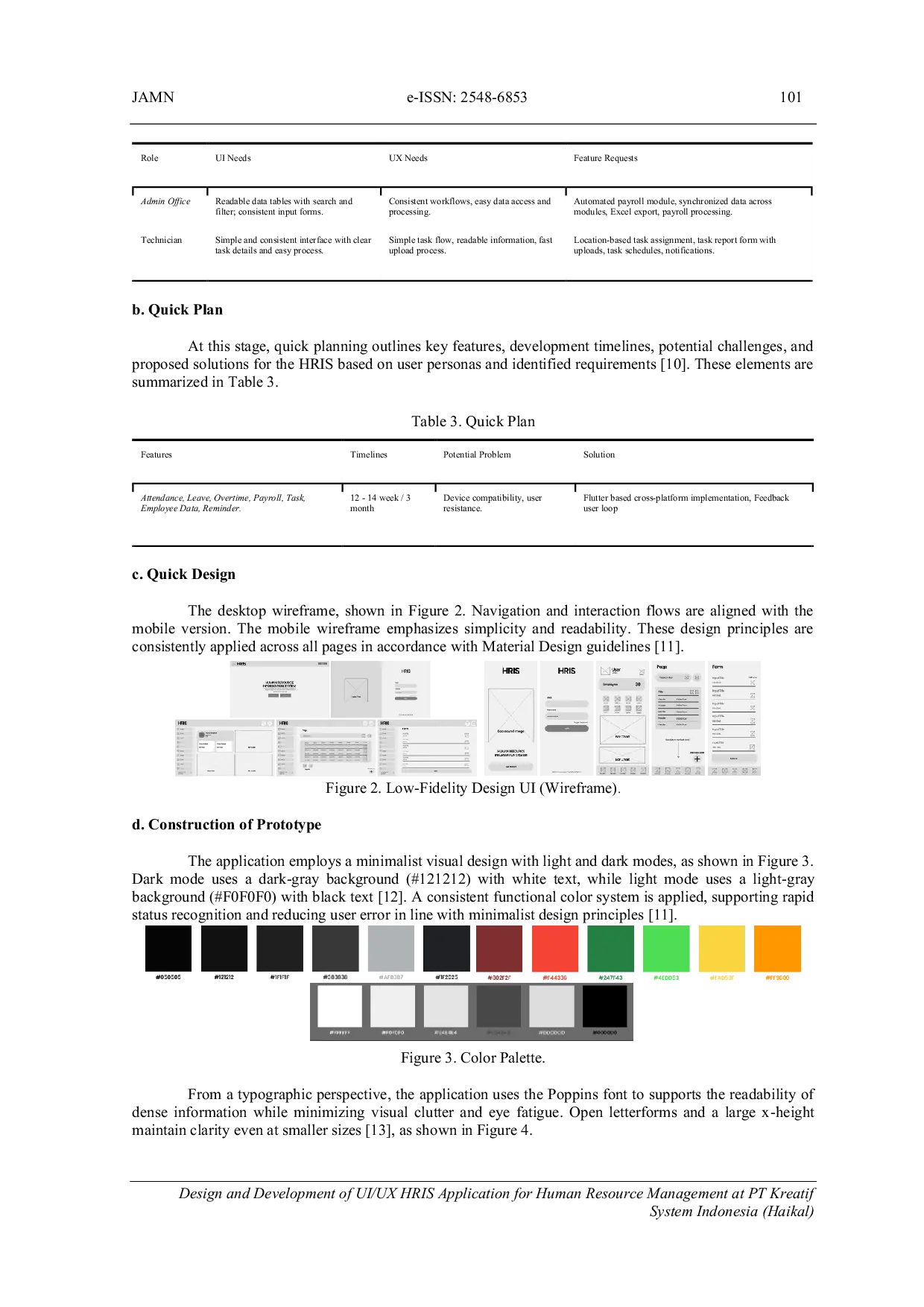 JOURNAL OF APPLIED MULTIMEDIA AND NETWORKINGJOURNAL OF APPLIED MULTIMEDIA AND NETWORKINGPenelitian ini berfokus secara eksklusif pada PT Kreatif System Indonesia untuk mengatasi tantangan operasional internalnya. Penelitian ini bertujuan untuk merancang antarmuka pengguna (UI) dan pengalaman pengguna (UX) yang konsisten, mudah digunakan, dan mudah diingat berdasarkan prinsip Material Design dan memvalidasinya melalui evaluasi kegunaan yang komprehensif. Hasil penelitian menunjukkan bahwa desain UI/UX yang konsisten secara signifikan meningkatkan efektivitas, efisiensi, dan kegunaan HRIS. TCR awal sebesar 87,85% dan TBE sebesar 0,0878 goals/detik meningkat menjadi 93,45% dan 0,1258 goals/detik setelah peningkatan UI/UX. Skor SUS sebesar 74,42 menunjukkan bahwa sistem dapat diterima dan diterima dengan baik.