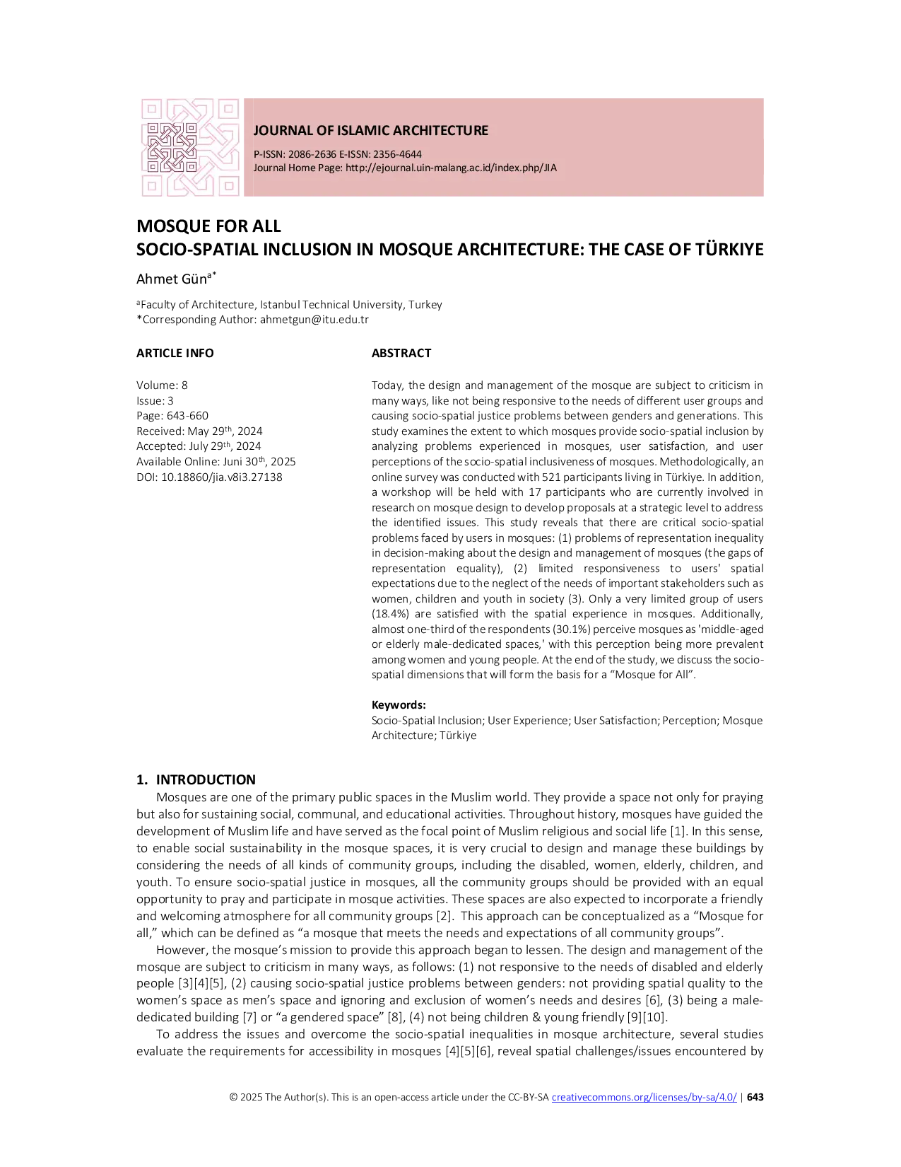 JIAJIADesain dan pengelolaan masjid saat ini menjadi subjek kritik karena tidak responsif terhadap kebutuhan kelompok pengguna yang berbeda dan menyebabkan masalah keadilan sosial-ruang antara gender dan generasi. Studi ini memeriksa sejauh mana masjid menyediakan inklusi sosial-ruang dengan menganalisis masalah yang dialami pengguna, kepuasan pengguna, dan persepsi pengguna tentang inklusi sosial-ruang masjid. Secara metodologis, survei online dilakukan dengan 521 peserta yang tinggal di Turki. Selain itu, akan diadakan workshop dengan 17 peserta yang saat ini terlibat dalam penelitian tentang desain masjid untuk mengembangkan proposal tingkat strategis untuk mengatasi masalah yang diidentifikasi. Studi ini mengungkapkan bahwa ada masalah sosial-ruang kritis yang dihadapi pengguna di masjid: (1) masalah ketidaksetaraan representasi dalam pengambilan keputusan tentang desain dan pengelolaan masjid (kesenjangan responsivitas terbatas terhadap kesetaraan representasi pengguna), (2) harapan karena diabaikan kebutuhan stakeholder penting seperti wanita, anak-anak, dan pemuda dalam masyarakat (3). Hanya kelompok pengguna yang sangat terbatas (18,4%) yang puas dengan pengalaman ruang di masjid. Selain itu, hampir sepertiga responden (30,1%) menganggap masjid sebagai ruang pria berusia menengah atau tua, dengan persepsi ini lebih umum di antara wanita dan orang muda. Di akhir studi, kami membahas dimensi sosial-ruang yang akan membentuk dasar untuk Masjid untuk Semua.