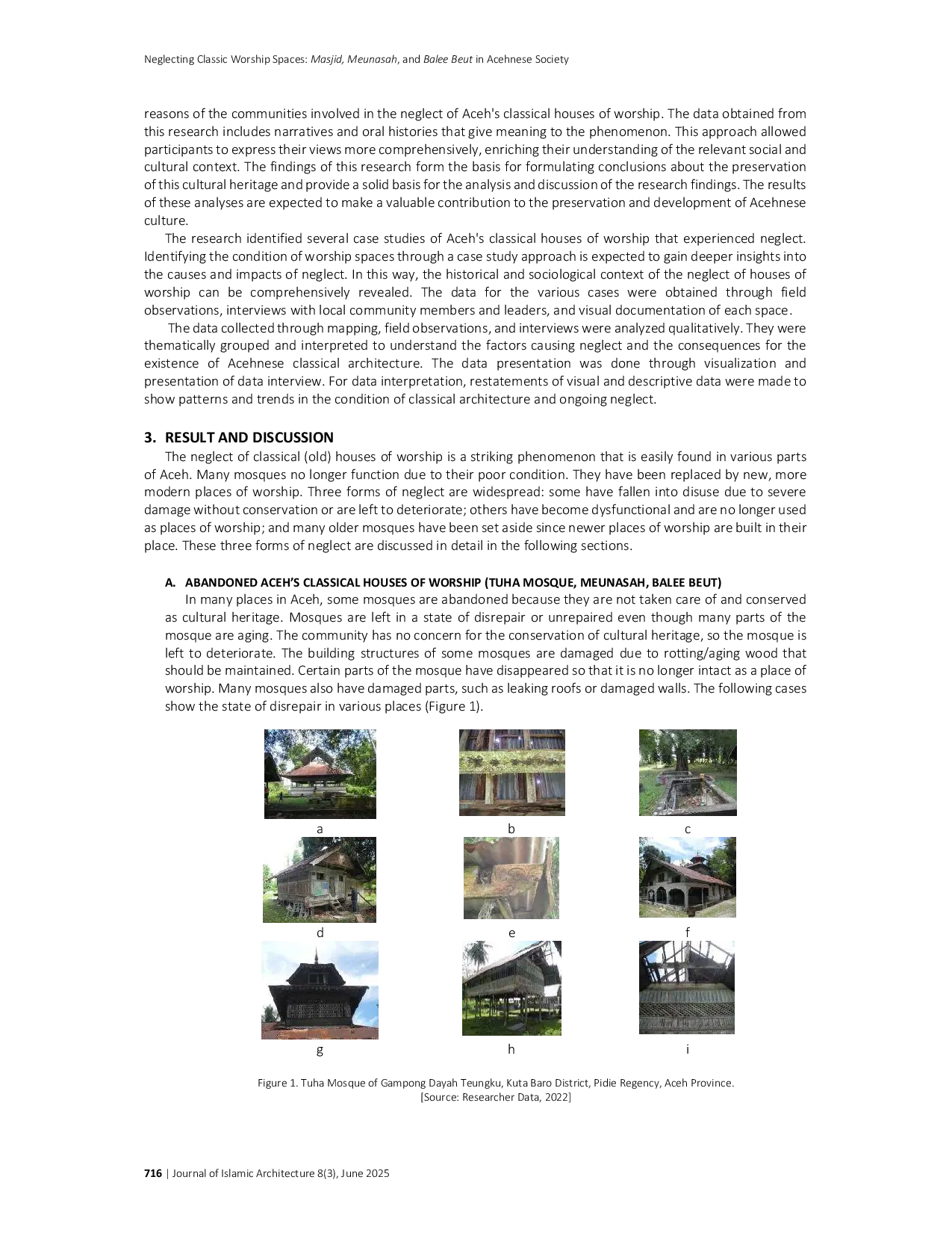 Penelitian ini menyimpulkan bahwa perubahan preferensi arsitektur ruang ibadah di Aceh merupakan hasil dari faktor-faktor kompleks dan saling terkait.Ketiga faktor utama yang diidentifikasi adalah disorientasi masyarakat terhadap gaya arsitektur Timur Tengah, arus modernisasi yang kuat, dan kelangkaan bahan serta keahlian ukir (utoh).Penelitian ini menekankan pentingnya upaya kolaboratif untuk melestarikan warisan budaya unik, rumah ibadah klasik Aceh, sambil tetap membuka pintu bagi inovasi dan modernisasi yang selaras dengan nilai-nilai lokal.