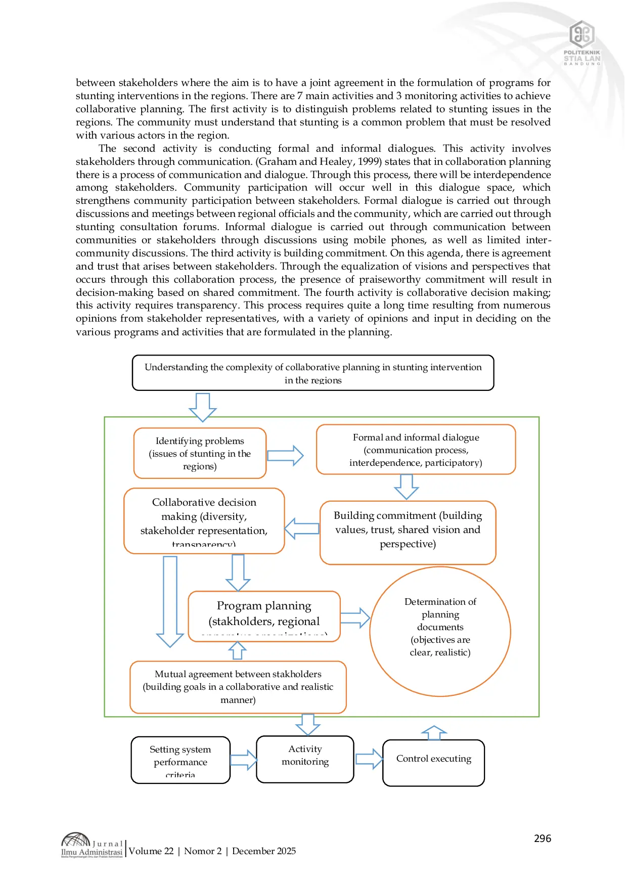 Jurnal Ilmu Administrasi: Media Pengembangan Ilmu dan Praktek AdministrasiJurnal Ilmu Administrasi: Media Pengembangan Ilmu dan Praktek AdministrasiMakalah ini mengusulkan sebuah model konseptual perencanaan kolaboratif untuk intervensi stunting di tingkat daerah. Penelitian intervensi stunting dianggap penting karena merupakan masalah global. Tujuan penelitian ini adalah mendeskripsikan proses kolaborasi serta mengembangkan model konseptual perencanaan kolaboratif. Pendekatan yang digunakan adalah pendekatan kualitatif dengan alat analisis Soft Systems Methodology (SSM) untuk mengembangkan model konseptual tersebut. Pengumpulan data dilakukan melalui wawancara semi‑terstruktur, diskusi kelompok terfokus (FGD), observasi, dan studi dokumen. Hasil penelitian menghasilkan model konseptual perencanaan kolaboratif sebagai solusi intervensi stunting untuk menentukan tujuan dan program yang akan dilaksanakan oleh pemerintah daerah. Melalui tahapan model ini, proses kolaboratif dapat dilaksanakan bersama pemangku kepentingan. Adaptasi lingkungan diperlukan agar implementasi model konseptual perencanaan kolaboratif berjalan lancar. Selain itu, keberagaman sosiokultural masyarakat berpotensi memengaruhi proses kolaboratif dalam perencanaan kolaboratif.