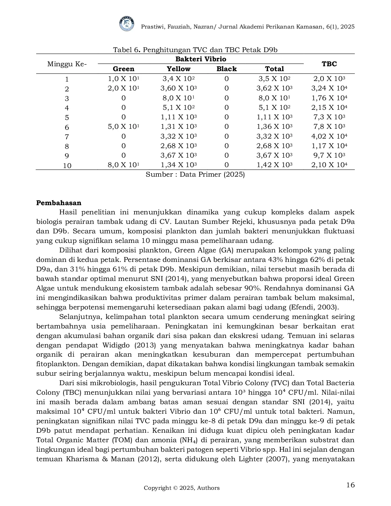 Jurnal Perikanan Kamasan: Smart, Fast, & Professional ServicesJurnal Perikanan Kamasan: Smart, Fast, & Professional ServicesPenelitian ini bertujuan untuk menganalisis kesesuaian kualitas air tambak dengan Standar Nasional Indonesia (SNI) dan Standar Operasional Prosedur (SOP) dalam budidaya udang vannamei (Litopenaeus vannamei) di CV. Lautan Sumber Rejeki, Banyuwangi, Jawa Timur. Parameter kualitas air yang diukur meliputi kecerahan, warna, suhu, tinggi air, pH, salinitas, ammonium, nitrit, fosfat, dissolved oxygen (DO), total organic matter (TOM), alkalinitas, kesadahan, kepadatan plankton, dan total bakteri. Hasil menunjukkan bahwa sebagian besar parameter seperti kecerahan (30–100 cm), suhu (28–32°C), salinitas (24–30 ppt), pH (7,8–8,7), dan DO (4,14–5,07 mg/L) berada dalam kisaran optimal sesuai SNI. Namun, parameter ammonium (0,02–0,8 mg/L), fosfat (0,025–1,32 mg/L), TOM (58–120 mg/L), alkalinitas (124–180 mg/L), dan total bakteri melebihi nilai standar. Pengelolaan kualitas air dilakukan melalui penyiponan, pergantian air, serta aplikasi probiotik, kapur, dan mineral. Penelitian ini menunjukkan pentingnya manajemen kualitas air yang berkelanjutan untuk mendukung produktivitas budidaya udang vannamei secara optimal.