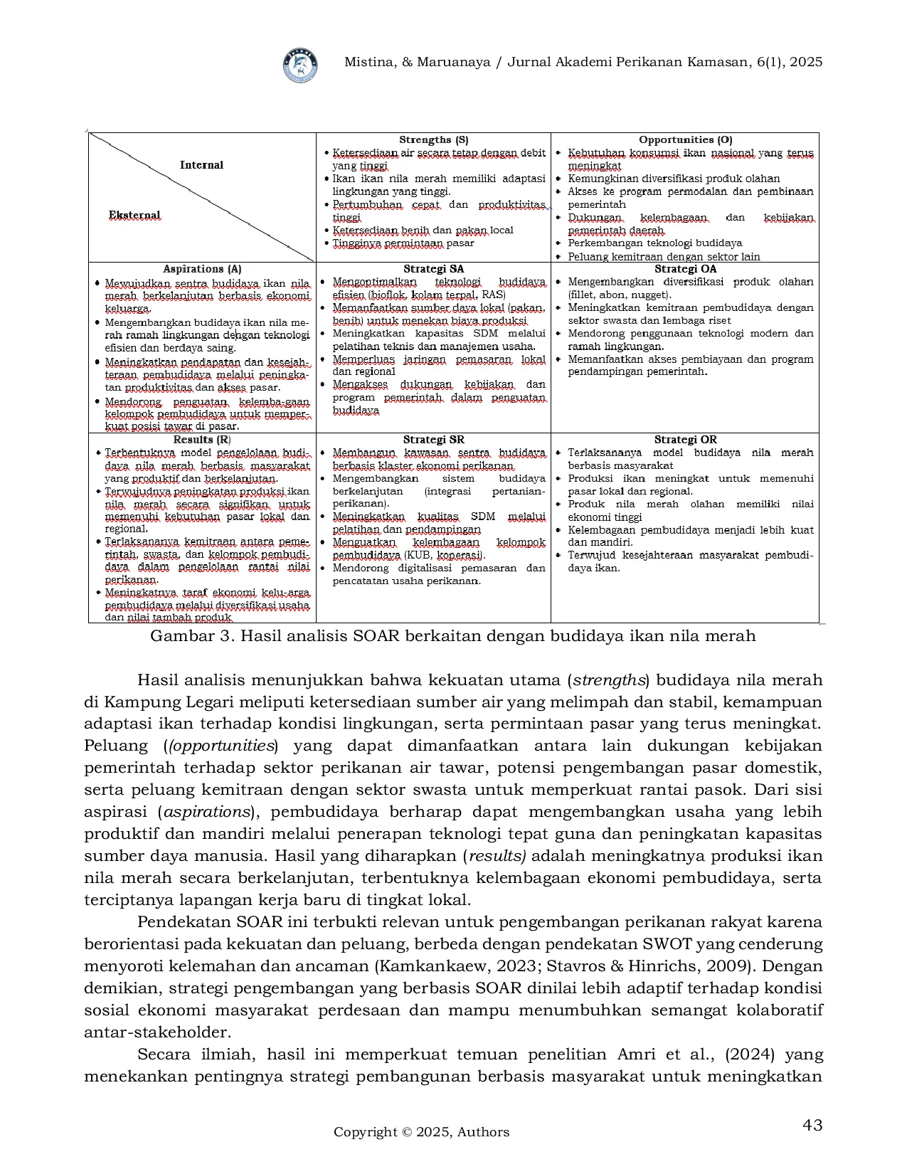 Jurnal Perikanan Kamasan: Smart, Fast, & Professional ServicesJurnal Perikanan Kamasan: Smart, Fast, & Professional ServicesIkan nila merah (Oreochromis sp.) memiliki nilai ekonomis tinggi dan berpotensi besar untuk dikembangkan sebagai komoditas unggulan perikanan budidaya. Kabupaten Nabire, khususnya Kampung Legari, Distrik Makimi, merupakan salah satu kawasan yang berpotensi untuk pengembangan budidaya tersebut. Penelitian ini bertujuan untuk mengkaji sistem budidaya ikan nila merah di Kampung Legari serta merumuskan strategi pengembangannya guna mendukung pertumbuhan ekonomi lokal. Penelitian dilaksanakan pada 9 Juni–21 Juli 2025 dan menggunakan pendekatan fenomenologis. Hasil penelitian menunjukkan bahwa budidaya ikan nila merah di Kampung Legari masih menggunakan kolam tanah dengan teknologi tradisional, produksi relatif rendah karena keterbatasan pakan komersial dan ketergantungan pada pakan alami, serta rantai pasok dan distribusi pascapanen tergantung pada tengkulak yang membatasi keuntungan. Model pengelolaan budidaya yang memperhatikan aspek teknis, ekonomi, sosial, dan lingkungan secara terpadu berpotensi meningkatkan efisiensi dan keberlanjutan produksi. Strategi pengembangan difokuskan pada penguatan potensi lokal, pemanfaatan peluang eksternal, serta pencapaian tujuan kolektif secara terukur.