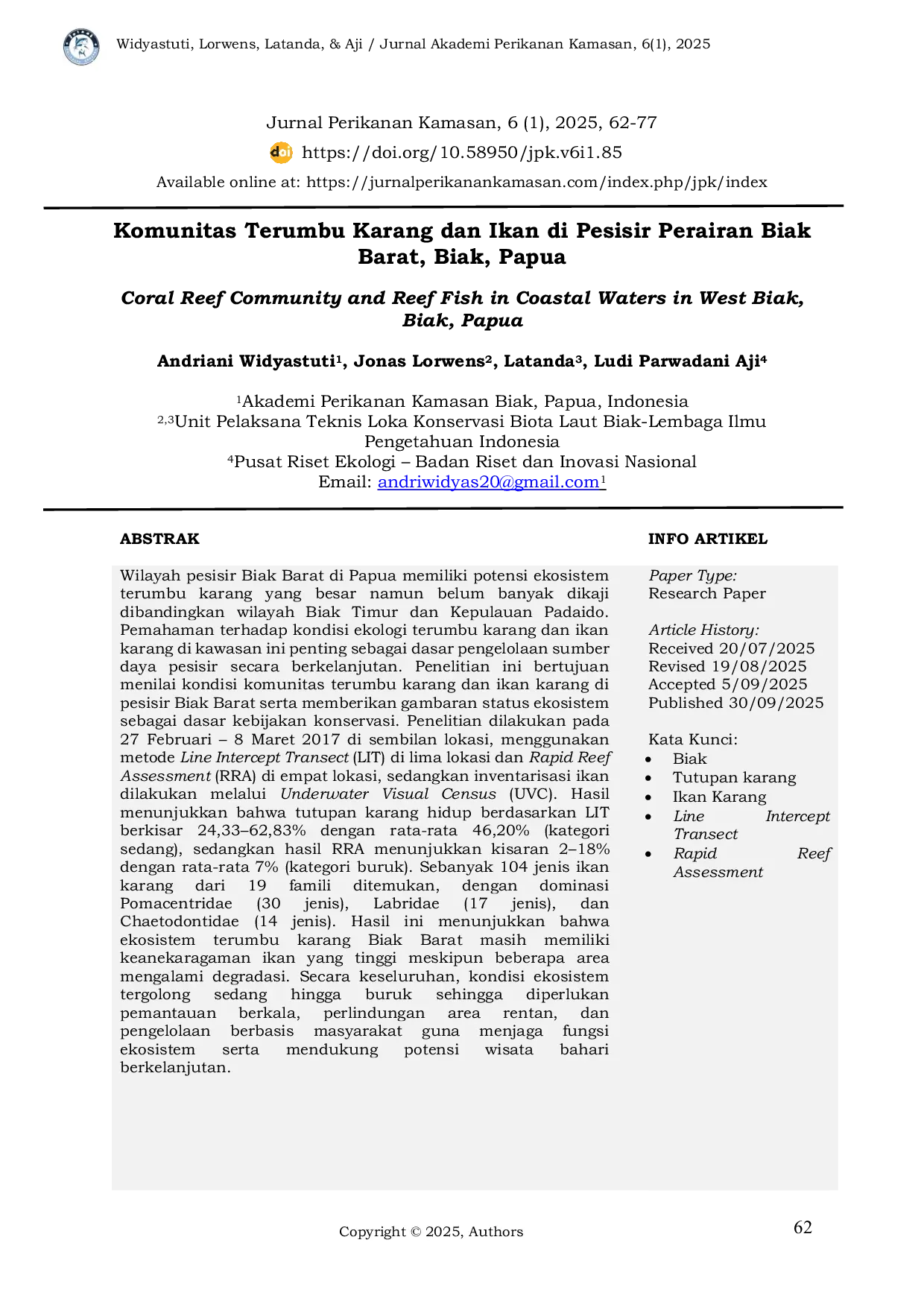 Hasil penelitian menunjukkan bahwa kondisi tutupan karang hidup di perairan Biak Barat berdasarkan metode LIT bervariasi antara 24,33% hingga 62,83%, dengan rata-rata 46,20% yang termasuk kategori sedang.Inventarisasi ikan karang mencatat 104 jenis dari 19 famili, dengan 99 jenis terdeteksi pada lima stasiun pengamatan.Secara umum, kondisi terumbu karang di wilayah Biak Barat masih tergolong cukup produktif dan memiliki keanekaragaman hayati yang tinggi, meskipun terdapat indikasi tekanan ekologis di beberapa lokasi.Temuan ini menegaskan pentingnya pengelolaan terumbu karang secara berkelanjutan untuk menjaga keseimbangan ekosistem dan manfaat ekonominya bagi masyarakat pesisir.
