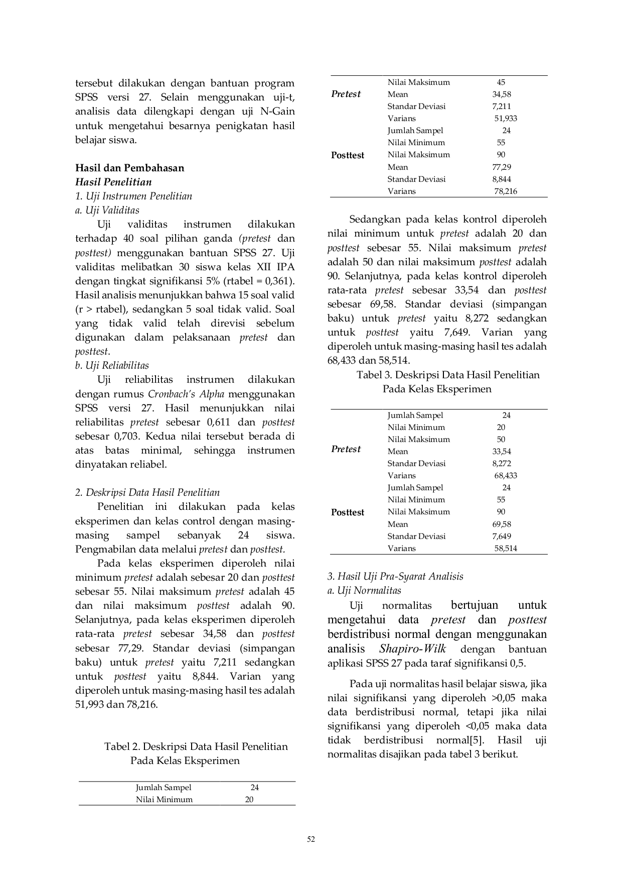 Berdasarkan hasil analisis data posttest independent sample t-test, diperoleh nilai signifikansi sebesar 0,002 (< 0,05), yang menunjukkan bahwa terdapat perbedaan yang signifikan antara hasil belajar siswa kelas eksperimen dan kelas kontrol.Selain itu, uji N-Gain menunjukkan bahwa rata-rata peningkatan hasil belajar pada kelas eksperimen mencapai 78,14% dan termasuk dalam kategori tinggi.Dengan demikian, dapat disimpulkan bahwa model pembelajaran flipped classroom memberikan pengaruh yang signifikan terhadap hasil belajar siswa pada materi laju reaksi.