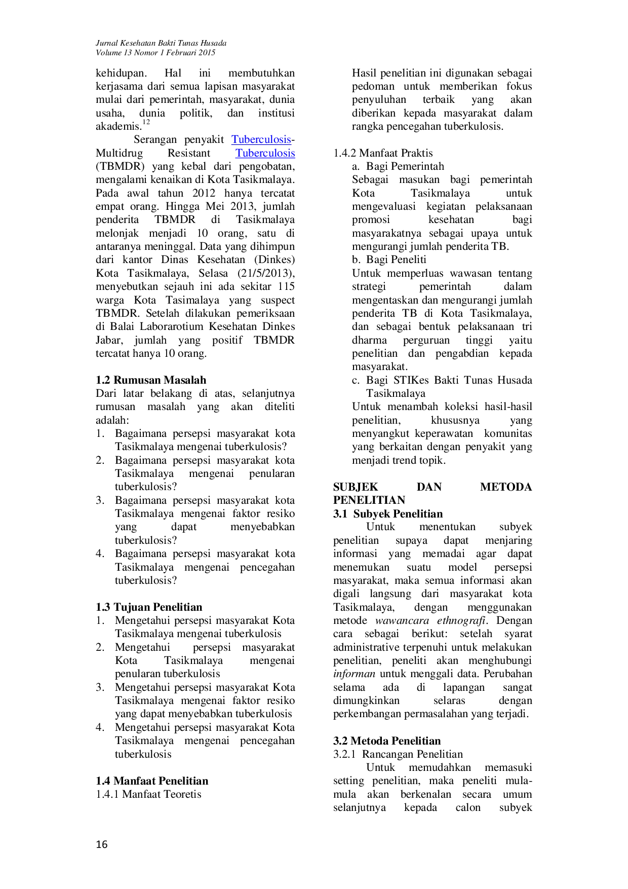 Jurnal Kesehatan Bakti Tunas Husada: Jurnal Ilmu-ilmu Keperawatan, Analis Kesehatan dan FarmasiJurnal Kesehatan Bakti Tunas Husada: Jurnal Ilmu-ilmu Keperawatan, Analis Kesehatan dan FarmasiTB paru merupakan salah satu penyakit infeksi yang menjadi masalah utama kesehatan masyarakat di dunia bahkan pada tahun 2003 WHO mencanangkan TB sebagai global emergency. Indonesia berada di urutan ke-3 setelah Cina dan India sebagai penyumbang penderita TB di dunia dengan angka kematian akibat TB yang amat tinggi, Asia termasuk episenter epidemi TB di dunia. Tujuan penelitian ini adalah untuk mengetahui persepsi masyarakat Kota Tasikmalaya mengenai tuberculosis, penularan, factor resiko dam pencegahan tuberculosis paru. Penelitian yang dilaksanakan merupakan penelitian kualitatif, subyek penelitian adalah masyarakat kota Tasikmalaya, data dikumpulkan dengan menggunakan metode wawancara ethnografi. Berdasarkan hasil penelitian dapat disimpulkan bahwa dari 20 responden 25% menyatakan bahwa tuberculosis paru merupakan batuk berdahak bercampur darah, 25% responden menyatakan bahwa Tuberkulosis paru disebabkan oleh kuman dan bakteri, 45% responden menyebutkan bahwa tuberculosis dapat menular ketika percikan ludah atau dahak penderita tuberculosis terhirup, 70% responden menyebutkan bahwa upaya terbaik untuk menghindari penularan tuberculosis paru adalah dengan menutup mulut/hidung saat batuk/bersin dan tidak meludah disembarang tempat . Perlu dilakukan penelitian lainnya yang berkaitan dengan sikap dan perilaku masyarakat yang dapat mempengaruhi kejadian tuberkulosis paru serta meningkatkan upaya promosi kesehatan.