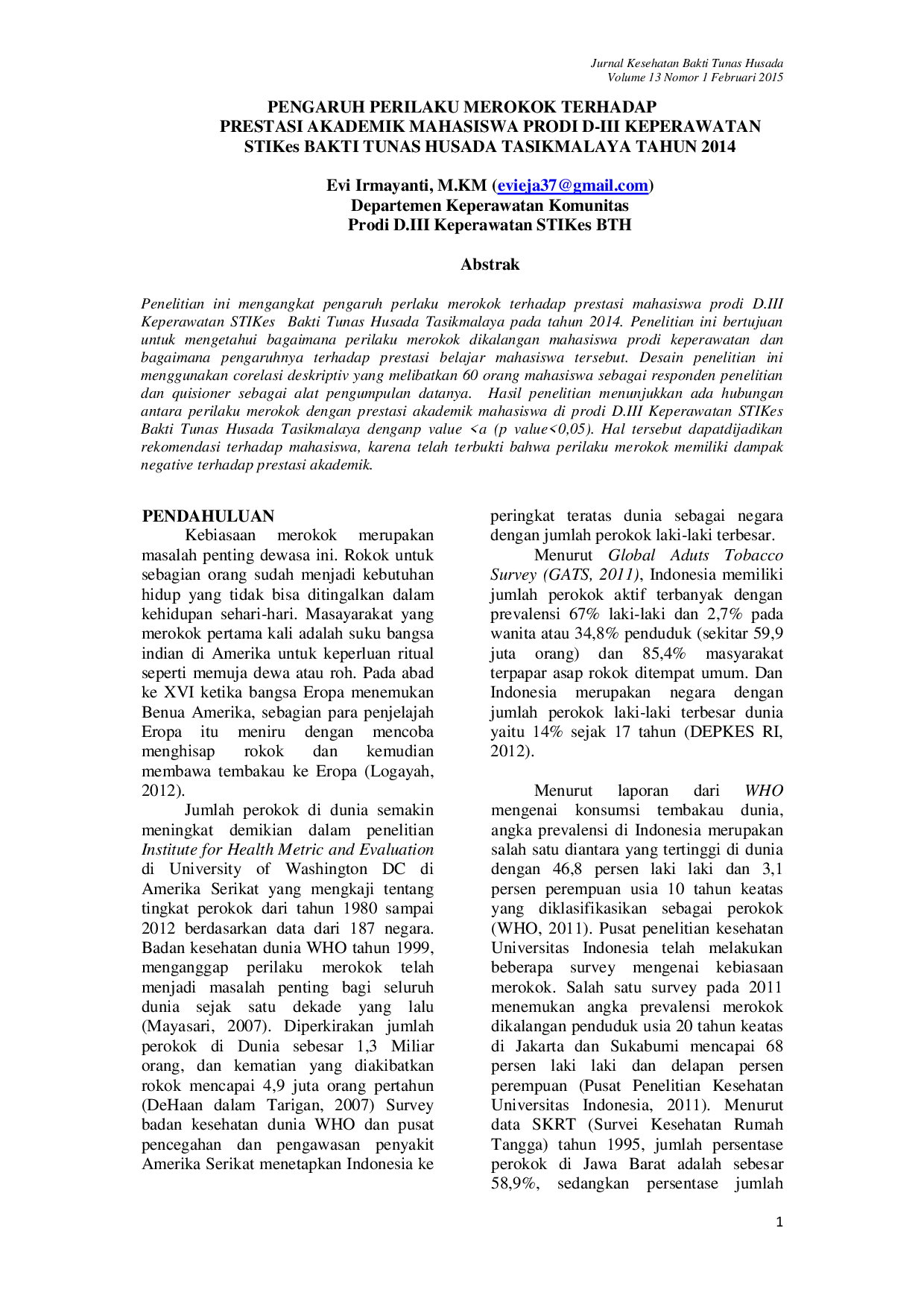 Jurnal Kesehatan Bakti Tunas Husada: Jurnal Ilmu-ilmu Keperawatan, Analis Kesehatan dan FarmasiJurnal Kesehatan Bakti Tunas Husada: Jurnal Ilmu-ilmu Keperawatan, Analis Kesehatan dan FarmasiPenelitian ini mengangkat pengaruh perilaku merokok terhadap prestasi mahasiswa prodi D.III Keperawatan STIKes Bakti Tunas Husada Tasikmalaya pada tahun 2014. Penelitian ini bertujuan untuk mengetahui bagaimana perilaku merokok di kalangan mahasiswa prodi keperawatan dan bagaimana pengaruhnya terhadap prestasi belajar mahasiswa tersebut. Desain penelitian ini menggunakan korelasi deskriptif yang melibatkan 60 orang mahasiswa sebagai responden penelitian dan quisioner sebagai alat pengumpulan datanya. Hasil penelitian menunjukkan ada hubungan antara perilaku merokok dengan prestasi akademik mahasiswa di prodi D.III Keperawatan STIKes Bakti Tunas Husada Tasikmalaya dengan p value