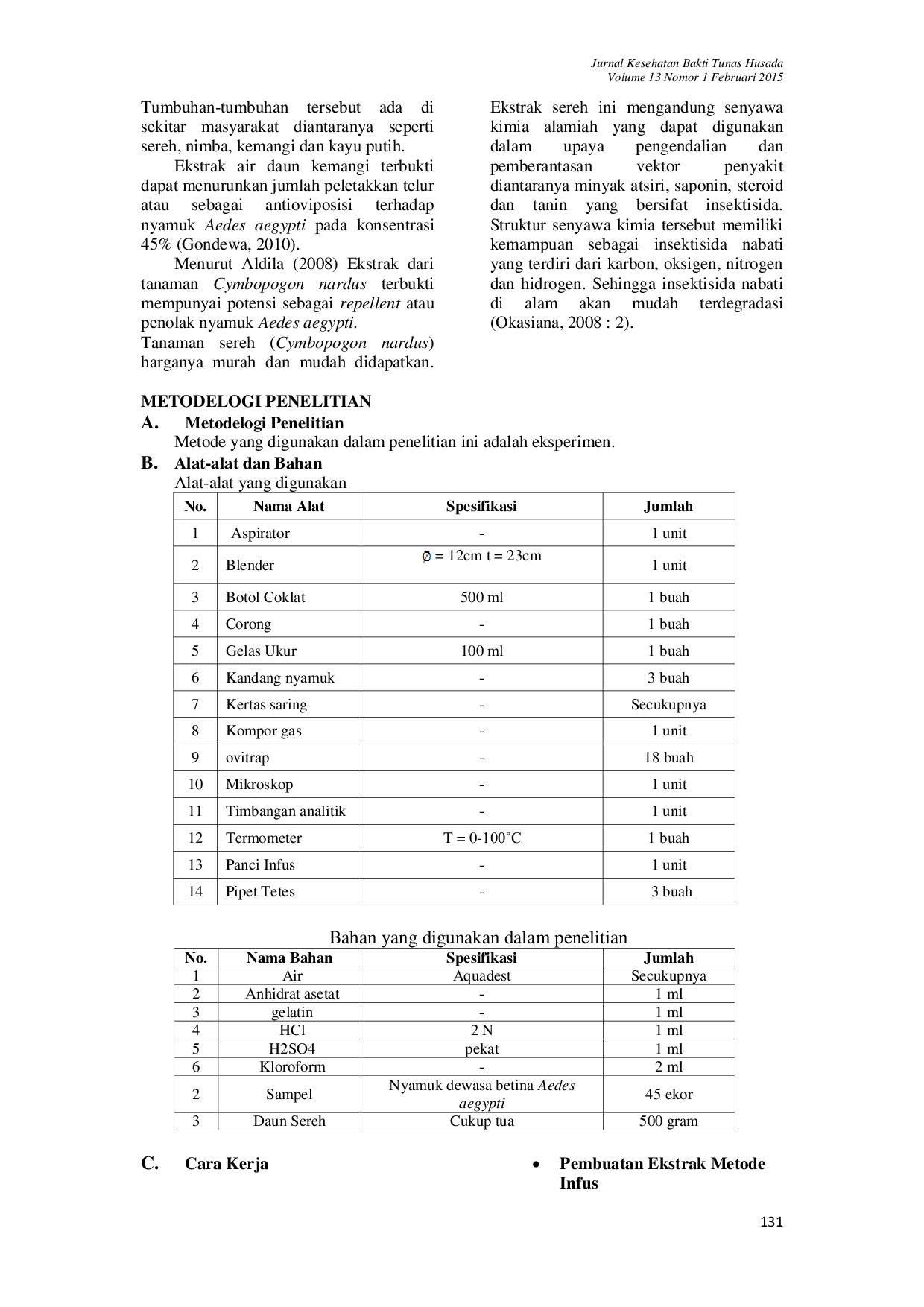 Jurnal Kesehatan Bakti Tunas Husada: Jurnal Ilmu-ilmu Keperawatan, Analis Kesehatan dan FarmasiJurnal Kesehatan Bakti Tunas Husada: Jurnal Ilmu-ilmu Keperawatan, Analis Kesehatan dan FarmasiPenelitian ini bertujuan untuk mengetahui efektivitas ekstrak daun sereh (Cymbopogon nardus) sebagai antioviposisi terhadap nyamuk Aedes aegypti. Metode yang digunakan adalah eksperimen dengan variasi konsentrasi ekstrak daun sereh (0%, 35%, 40%, 45%, 50%, dan 55%) pada kandang berisi 15 ekor nyamuk. Hasil penelitian menunjukkan bahwa konsentrasi ekstrak daun sereh yang lebih tinggi akan mengurangi jumlah telur yang diletakkan nyamuk. Konsentrasi 55% terbukti efektif mencegah peletakkan telur nyamuk Aedes aegypti, membuktikan bahwa sereh dapat digunakan sebagai antioviposisi atau menurunkan aktivitas peletakkan telur nyamuk Aedes aegypti.