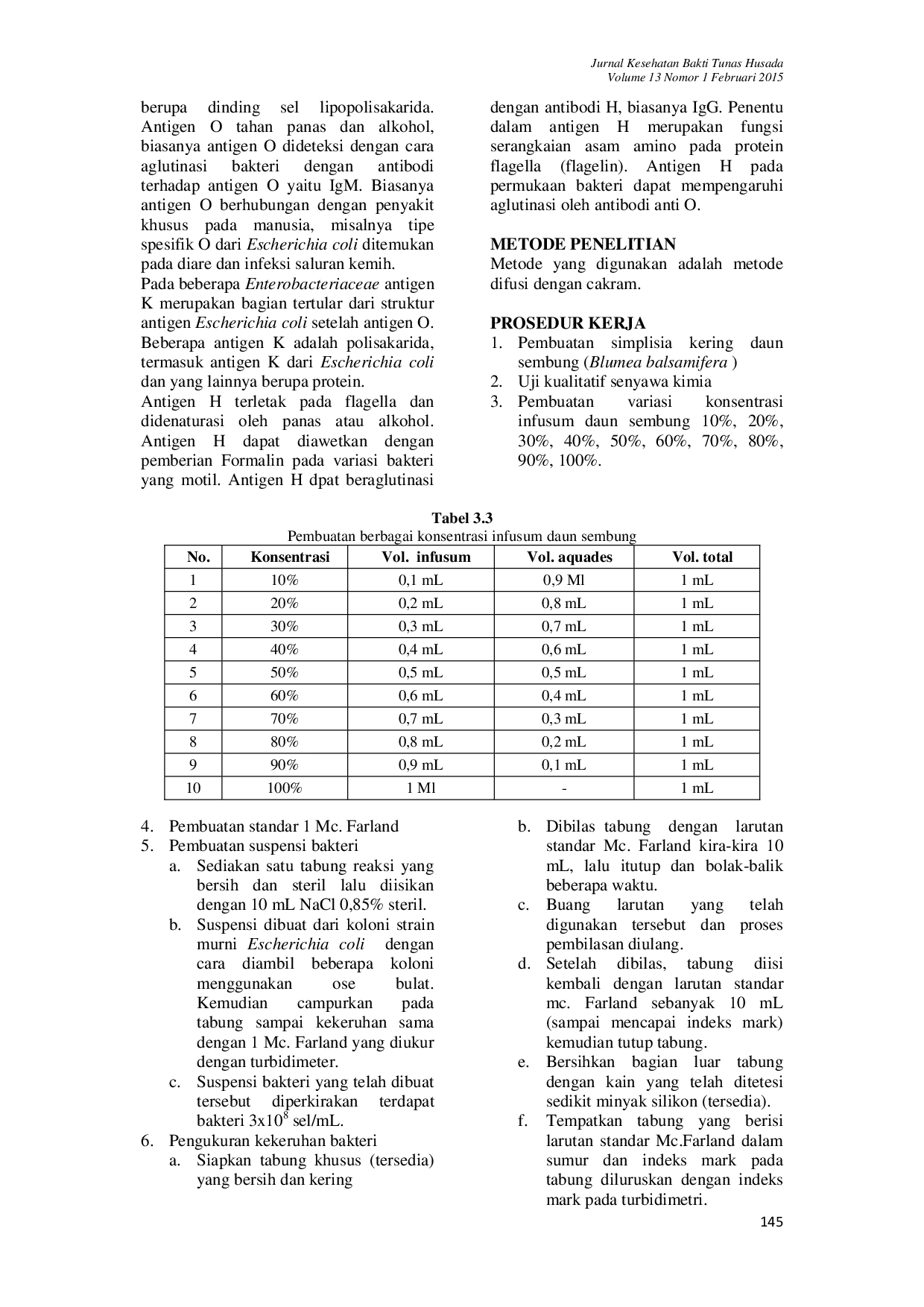 Jurnal Kesehatan Bakti Tunas Husada: Jurnal Ilmu-ilmu Keperawatan, Analis Kesehatan dan FarmasiJurnal Kesehatan Bakti Tunas Husada: Jurnal Ilmu-ilmu Keperawatan, Analis Kesehatan dan FarmasiDaun sembung (Blumea balsamifera) merupakan salah satu tanaman yang bisa dimanfaatkan sebagai obat tradisional. Zat aktif yang terdapat dalam daun sembung (Blumea balsamifera) antara lain tanin dan saponin yang berfungsi sebagai antibakteri. Tujuan dari penelitian ini adalah untuk mengetahui konsentrasi daya hambat infusum daun sembung (Blumea balsamifera) terhadap pertumbuhan bakteri Escherichia coli. Variasi konsentrasi infusum dibuat dengan rentang 10%-100% dengan kepadatan bakteri 3x108 /ml. Metode yang dipakai pada penelitian ini adalah metode Kirby-Bauer. Dari pengamatan diketahui infusum daun sembung (Blumea balsamifera) dapat menghambat pertumbuhan bakteri Escherichia coli pada konsentrasi 90% yaitu 4,2 mm. Kesimpulannya bahan infusum daun sembung (Blumea balsamifera) memiliki daya hambat terhadap pertumbuhan bakteri Escherichia coli.