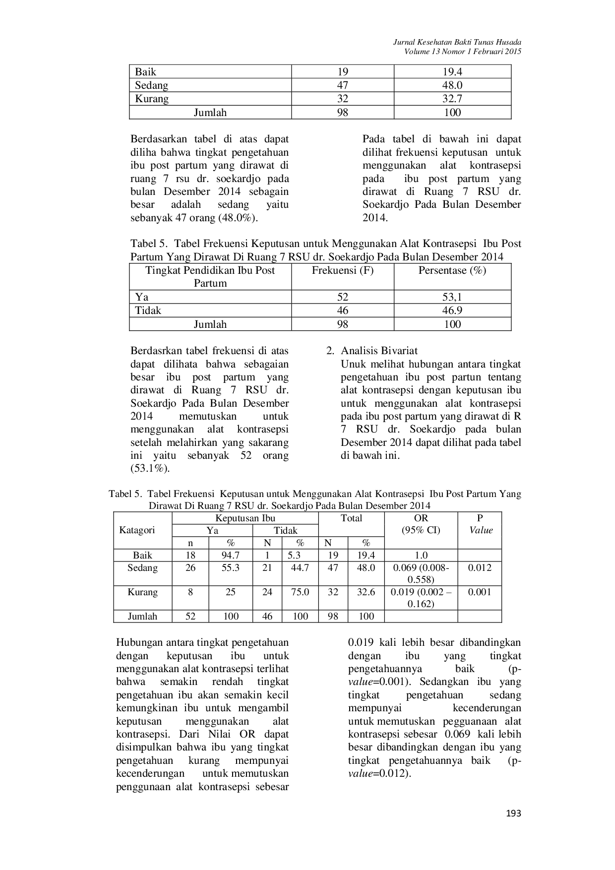 Jurnal Kesehatan Bakti Tunas Husada: Jurnal Ilmu-ilmu Keperawatan, Analis Kesehatan dan FarmasiJurnal Kesehatan Bakti Tunas Husada: Jurnal Ilmu-ilmu Keperawatan, Analis Kesehatan dan FarmasiPenelitian ini dilatarbelakangi dengan masih ditemukan ibu-ibu post partum yang belum bisa memutuskan untuk penggunaan alat kontrasepsi dengan alasan bingun atau tidak tahu alat kontrasepsi yang cocok untuk dirinya.. Tujuan dari penelitian ini adalah untuk mengetahui hubungan antara tingkat pengetahuan ibu tentang alat kontrasepsi dengan keputusan ibu dalam penggunaan alat kontrasepsi pada ibu post partum di ruang 7 RSU dr. Soekardjo Tasikmalaya. Jenis penelitian deskriptif korelasi dengan menggunakan pendekatan cross sectinal. Jumlah sampel sebesar 98 ibu post partum dengan teknik pengambilan sampel secara purposive sample. Hasil penelitian menunjukan bahwa ada hubungan antara tingkat pengetahuan tentang alat kontraspsi dengan keputusan ibu dalam penggunaan alat kontrasepsi. Ibu post partum yang menjadi responden yang tingkat pengetahuan kurang mempunyai kecenderungan untuk memutuskan penggunaan alat kontrasepsi sebesar 0.019 kali lebih besar dibandingkan dengan ibu yang tingkat pengetahuannya baik (p-value=0.001). Ibu post partum yang menjadi sedang mempunyai kecenderungan untuk memutuskan pegguanaan alat kontrasepsi sebesar 0.069 kali lebih besar dibandingkan dengan ibu yang tingkat pengetahuannya baik (p-value=0.012).